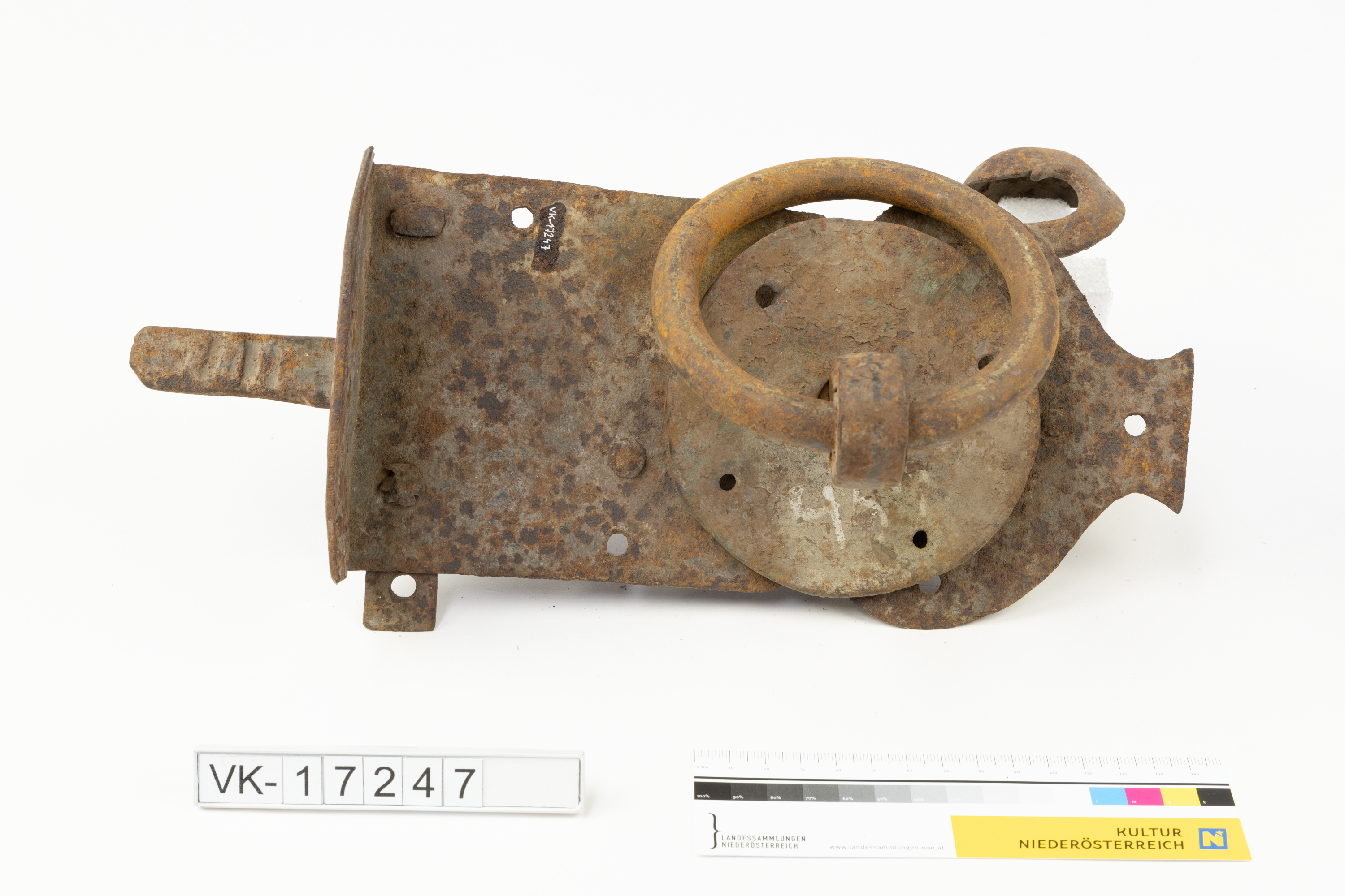 Schmiedeeisernes, teilweise offenes Türschloss auf einer auf einer Seite geschwungen auslaufenden Platte mit verzierter Schnalle, Drehring (mit Türbeschlag) und Hebefalle.