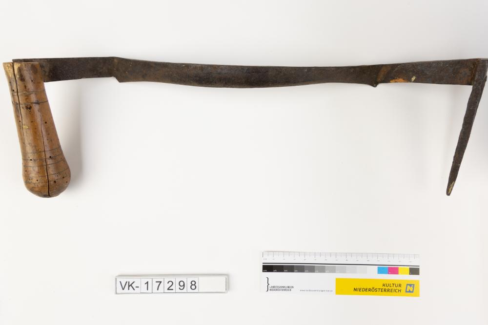 Leicht gebogenes Reifmesser mit einem gedrechselten Holzheft und einer spitz zulaufenden Angel. Auf der Klinge ist ein Schmiedezeichen in Form eines Schüssels eingeschlagen.