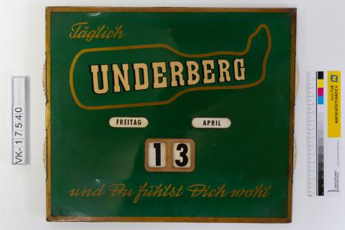 Bedrucktes Werbeschild für eine Gaststube mit integriertem Kalender (mit Rändelrädchen seitlich einzustellen). Die Werbebeschriftung ist in grün und gold gedruckt (Fa. Underberg). Auf der Rückseite ist der Hersteller angegeben.