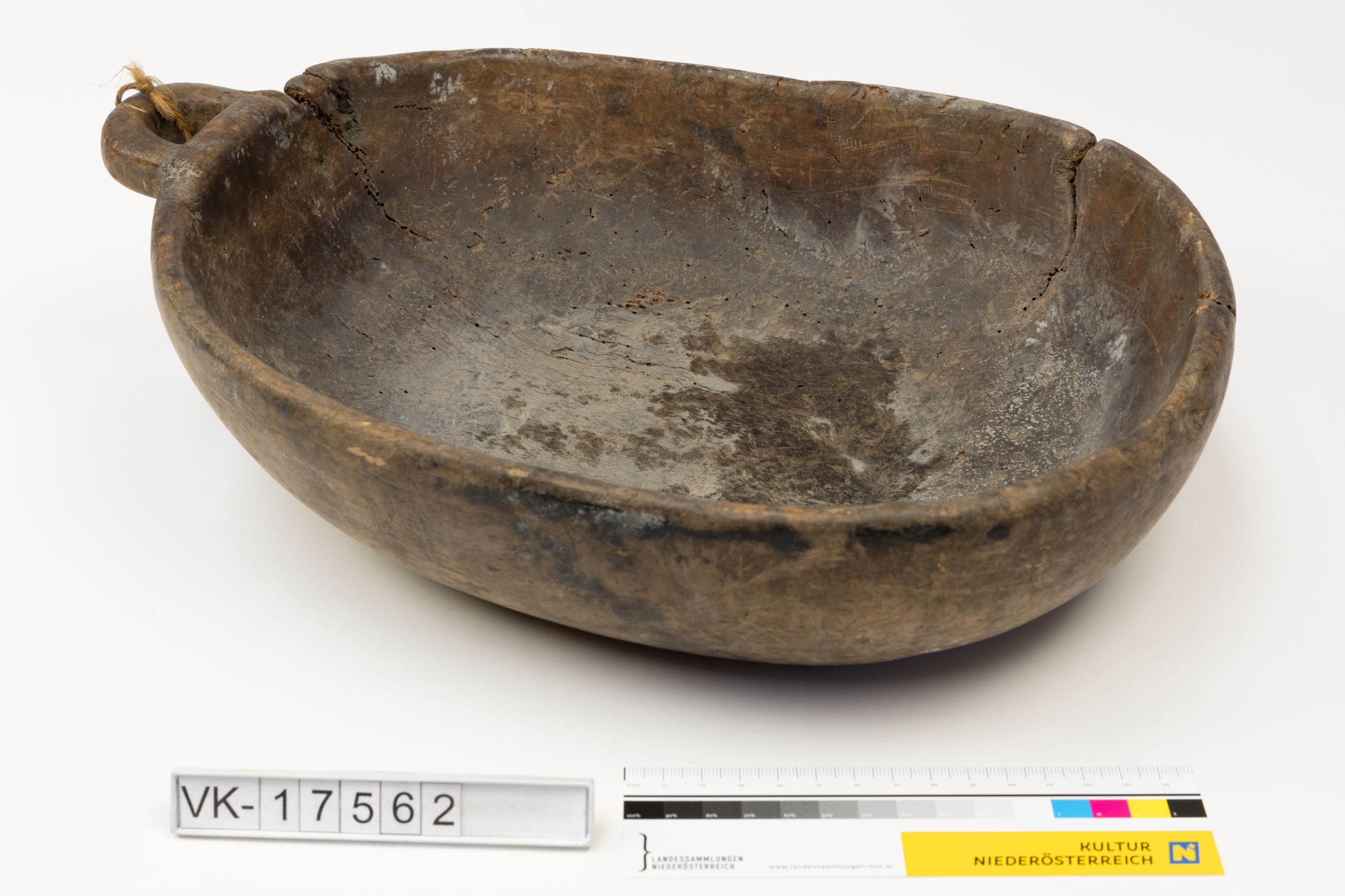 Ovale Schüssel aus Holz mit einem Henkel. Die Schüssel ist aus einem Stück geschnitzt und weist eine ältere Reparaturstelle auf.