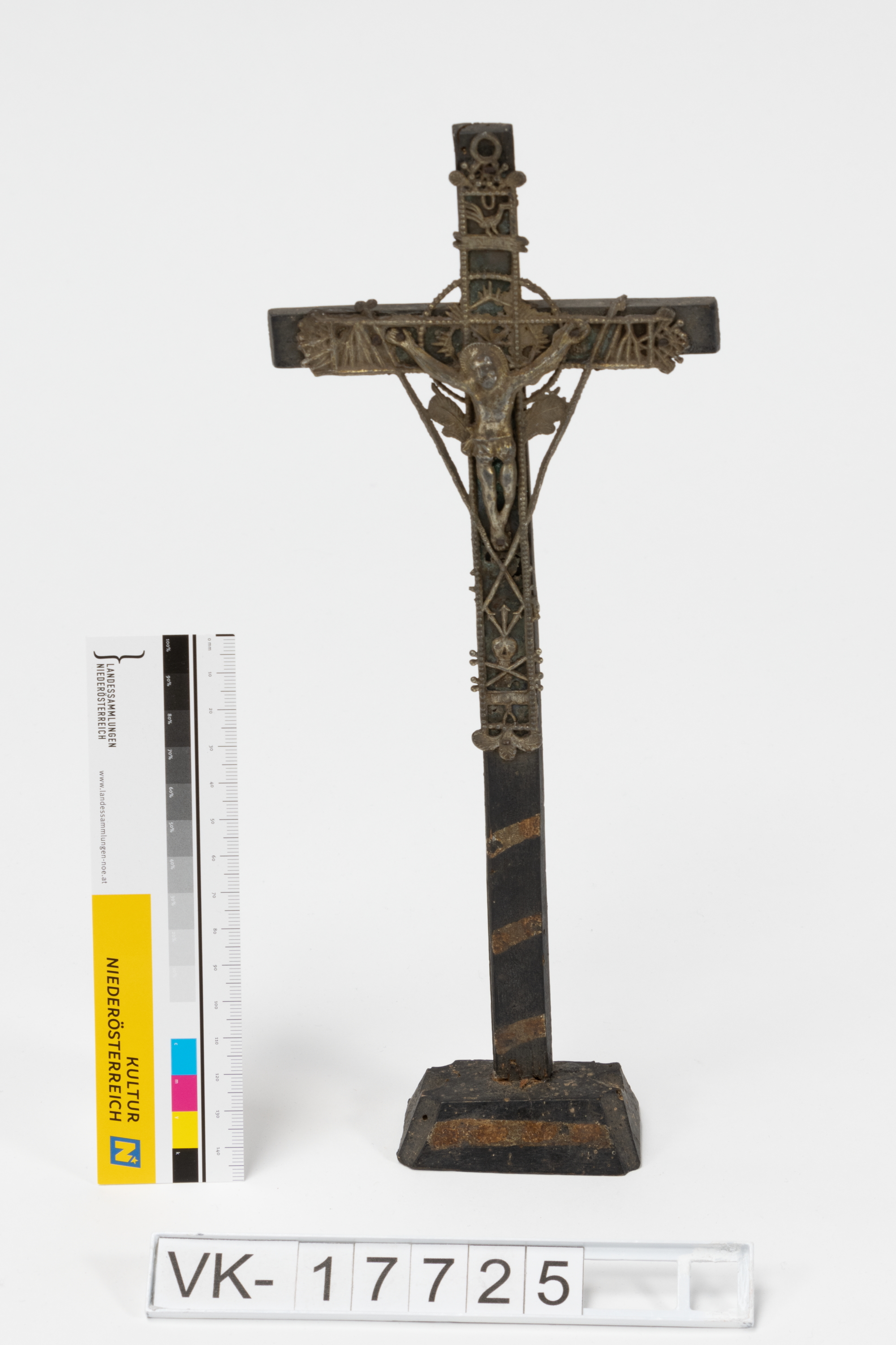 Holzkreuz mit darauf montiertem durchbrochenem Messingkruzifix mit Leidenswerkzeugen. Das Kreuz hat einen rechteckigen Standfuß.