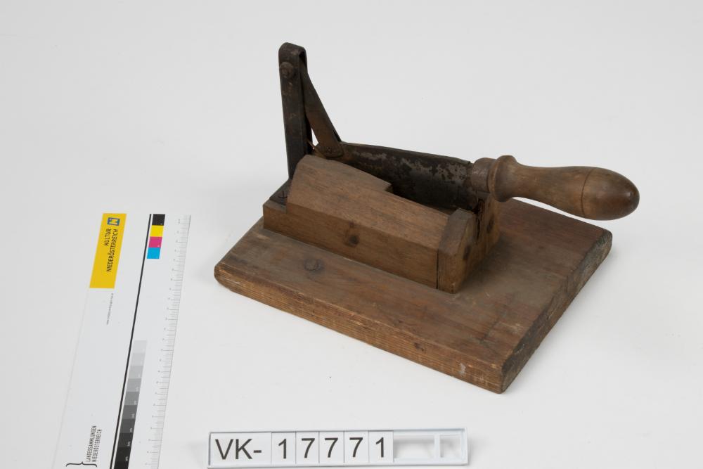 Zuckerbrecher mit einem Hackmesser mit Holzgriff, das beweglich auf einer Grundplatte mit einer Haltevorrichtung montiert ist; am Boden der Grundplatte sind vier Mal die Buchstaben "LO" eingebrannt.