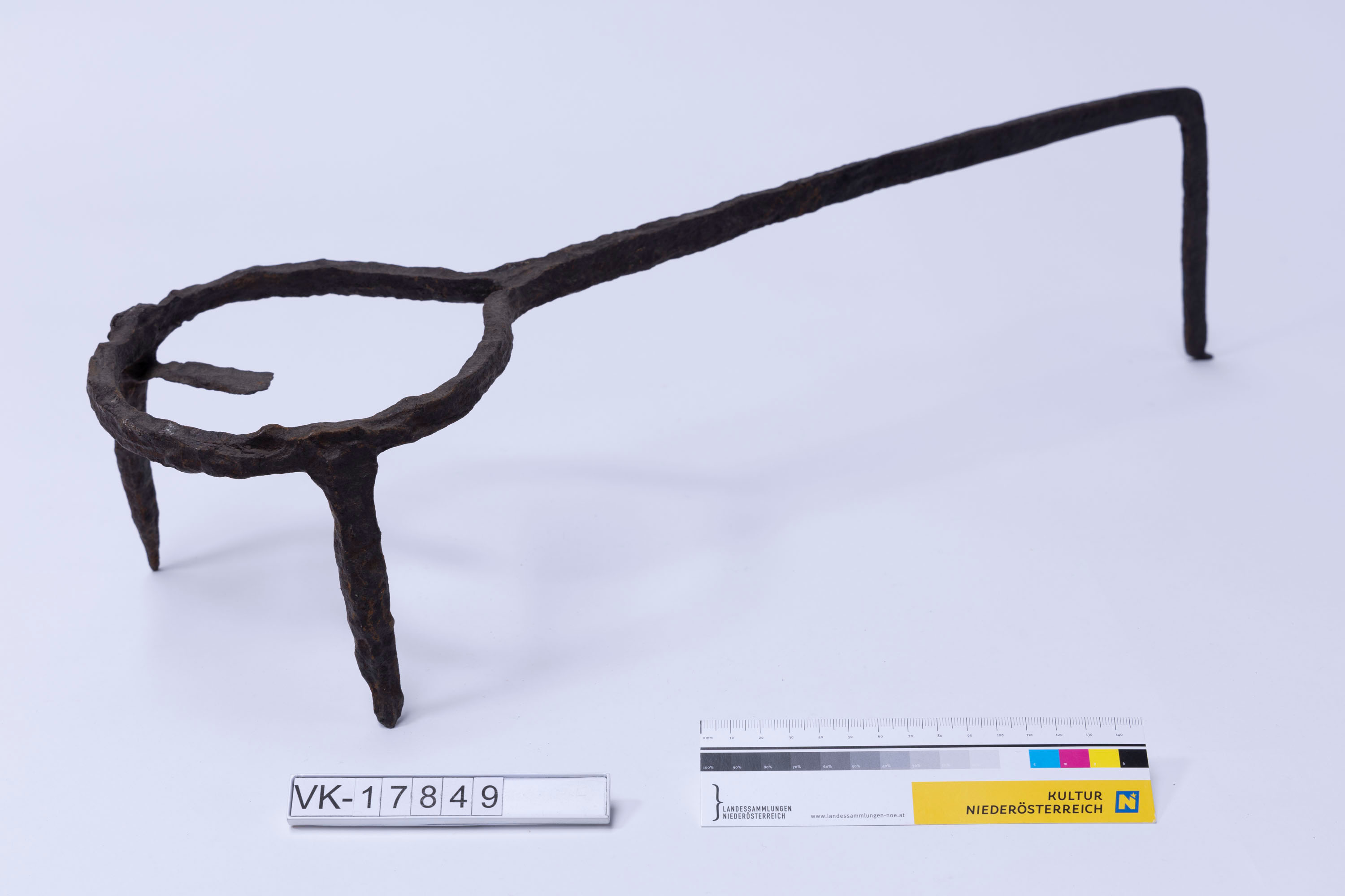 Runder Pfannenuntersetzer (Pfannenknecht) mit drei Füßen und einem langen Stiel.