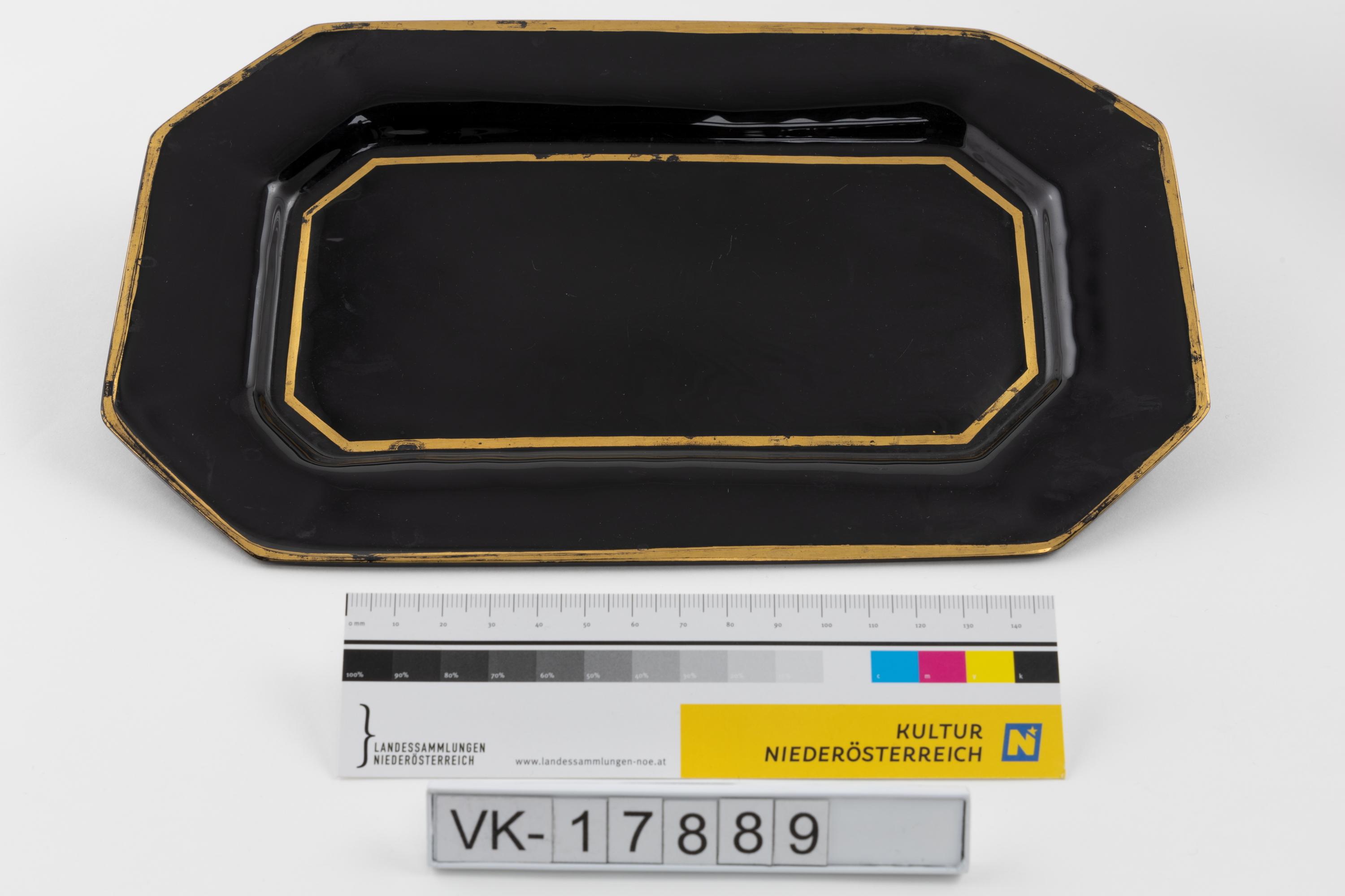 Achteckiges Tablett aus schwarzem Glas mit goldenen Linien.