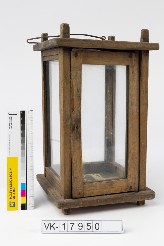 Viereckige Laterne mit Holzrahmen, Glaseinsätzen, einem Türchen und einem Drahtbügel als Henkel.