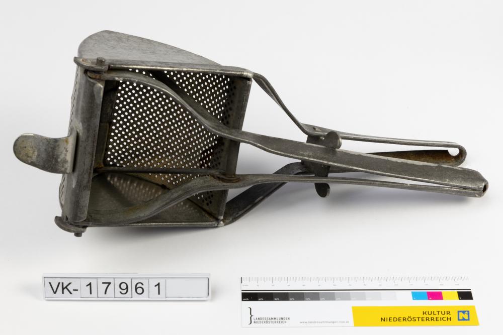 Kartoffelpresse mit zwei Griffen, einem teilweise gelochten Behälter und einem Haken als Gegenhalter.