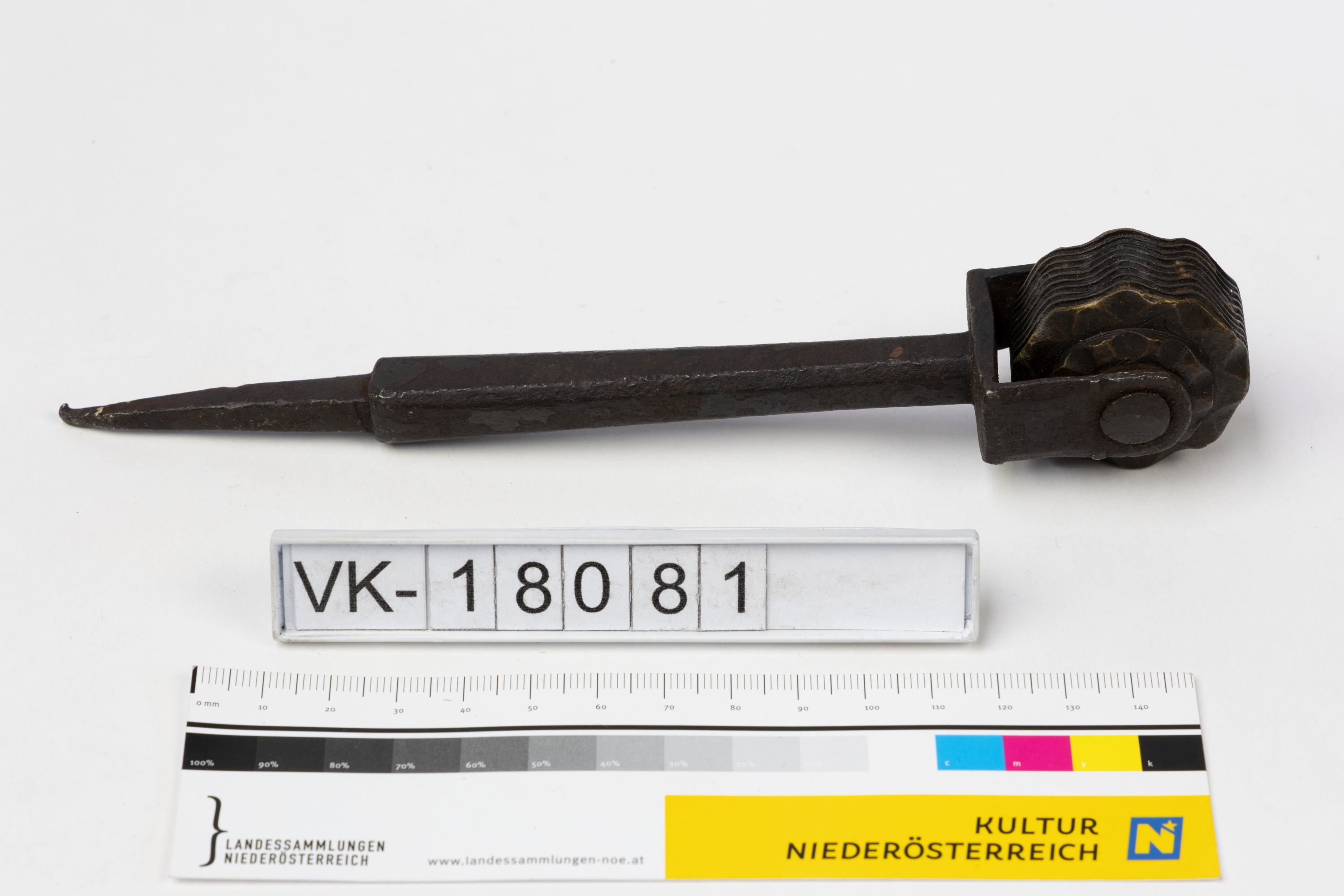 Zierrad aus Messing zum Aufbringen eines Wellenmusters, geführt in einer schmiedeeisernen Gabel mit vierkantigem Stiel und Angel.