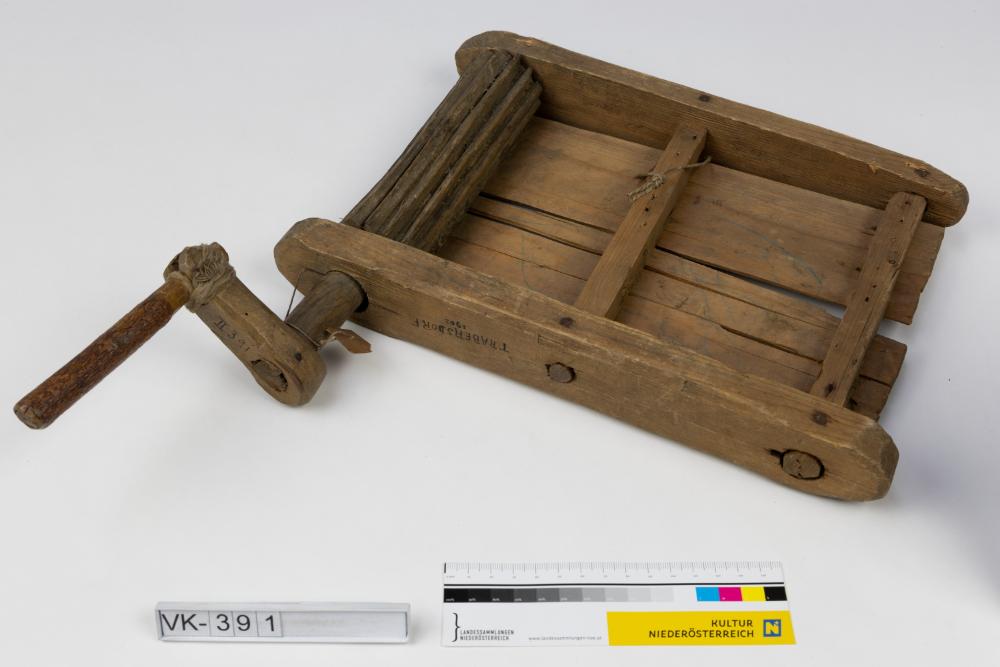 Handratsche mit einer Holzkurbel, einem Zahnrad und einem breiten in einem Rahmen gespannten Holzblatt.
