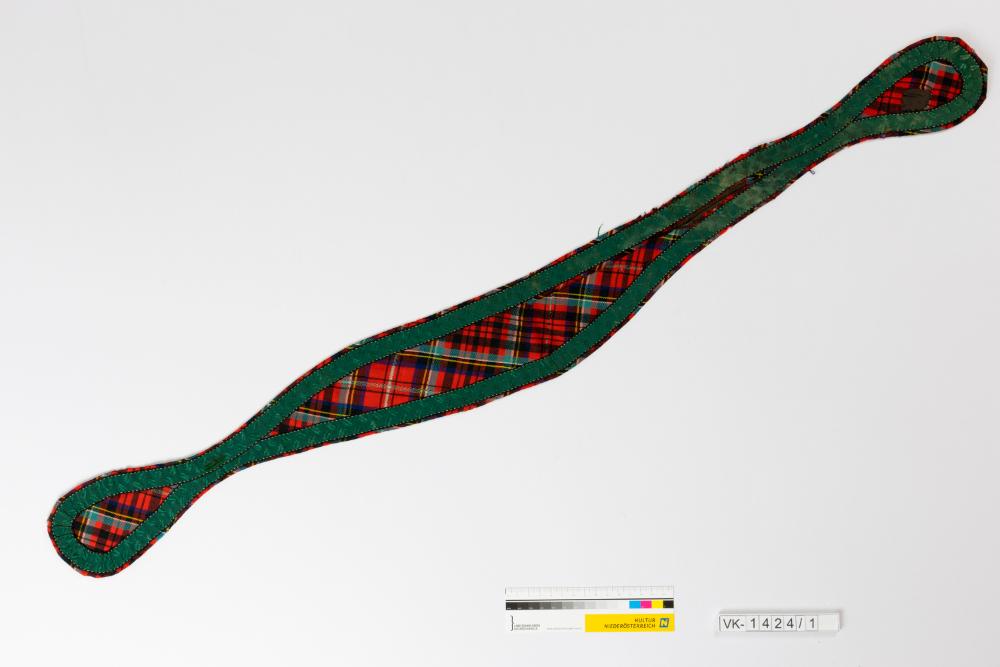 Chemisette (Halstuch) aus Schafwolle in rot, schwarz, grün und gelb gemustertem Schottenkaro, mit einer umlaufenden Borte aus gemustertem grünem Seidenrips. Das Halstuch hat angeschnittene tropfenförmige Latzteile und ist mit braunem gemustertem Baumwollstoff gefüttert.