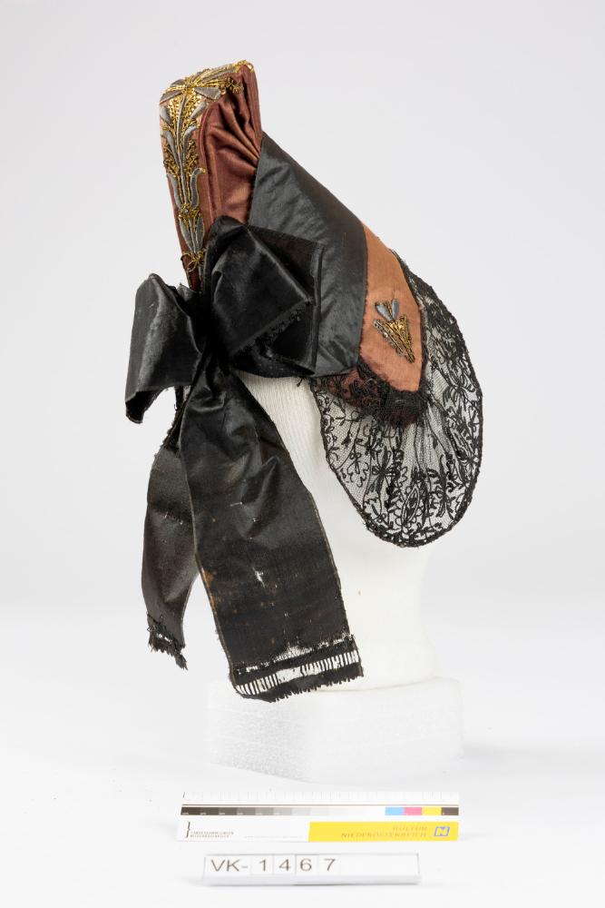 Hornputzhaube (Saurüsselhaube) aus rosa Taft mit schwarzer Schleife und Goldstickerei (mit Pailletten): Dichte Stickerei auf dem Boden, kleine Stickelemente über dem Schirm. Der Schirm ist aus schwarzer Tüllspitze und mit Draht verstärkt.