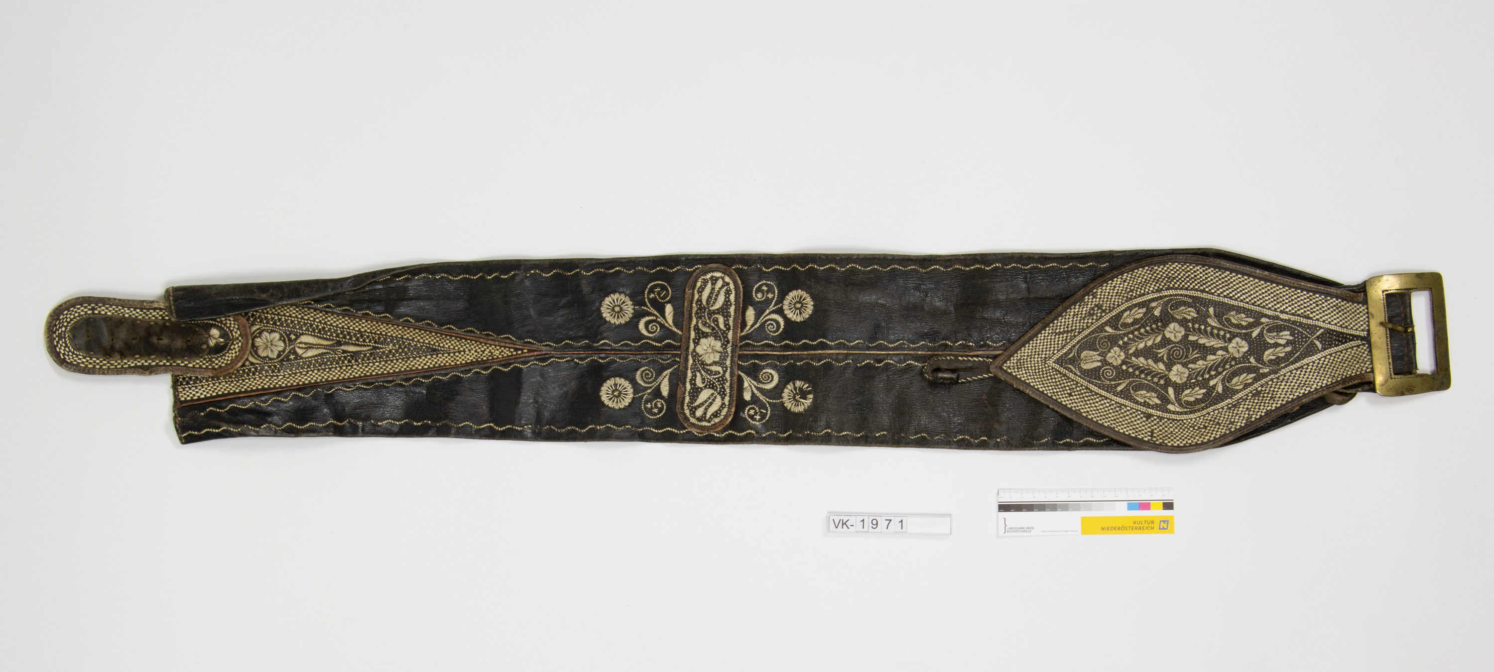 Breiter Ledergürtel mit großer Messingschnalle und Kielstickerei: Ein linsenförmiges Schild mit stilisierten Blüten und ornamentalem Blattwerk sowie ein dreieckiges Element mit Blüte und Blattwerk und eine ebensolche Stickerei in der Mitte des Gürtels.