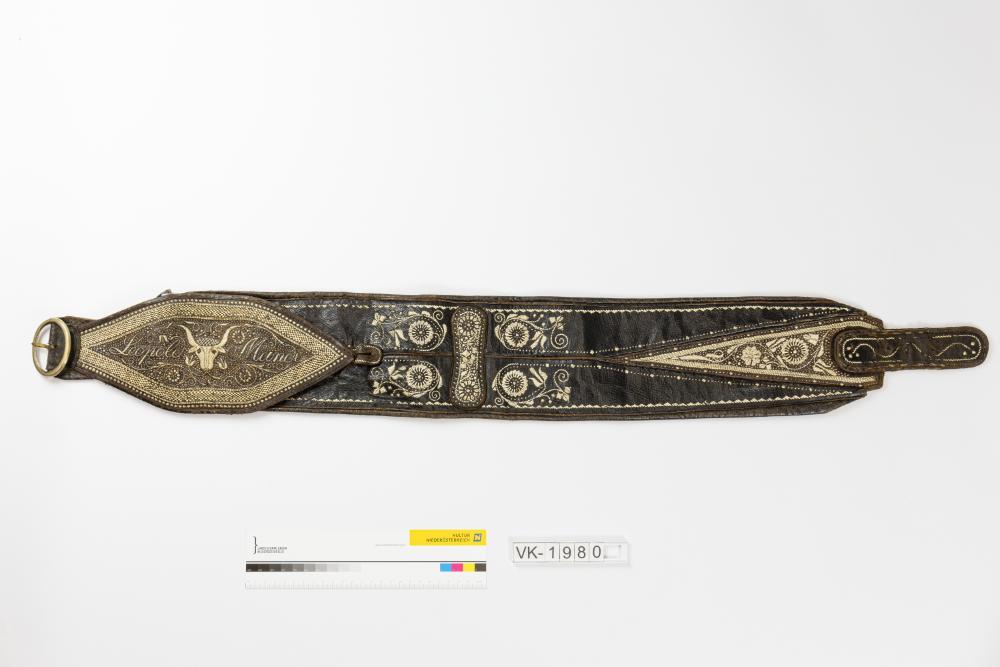 Breiter Ledergürtel (Bauchranzen) mit einer großen Schnalle und einem linsenförmigen Schild. Der Gürtel ist mit Federkielstickerei bestickt: Zierbänder, stilisiert-florale Motive, ein Rinderkopf und die Beschriftung: "Leopold Mandl".