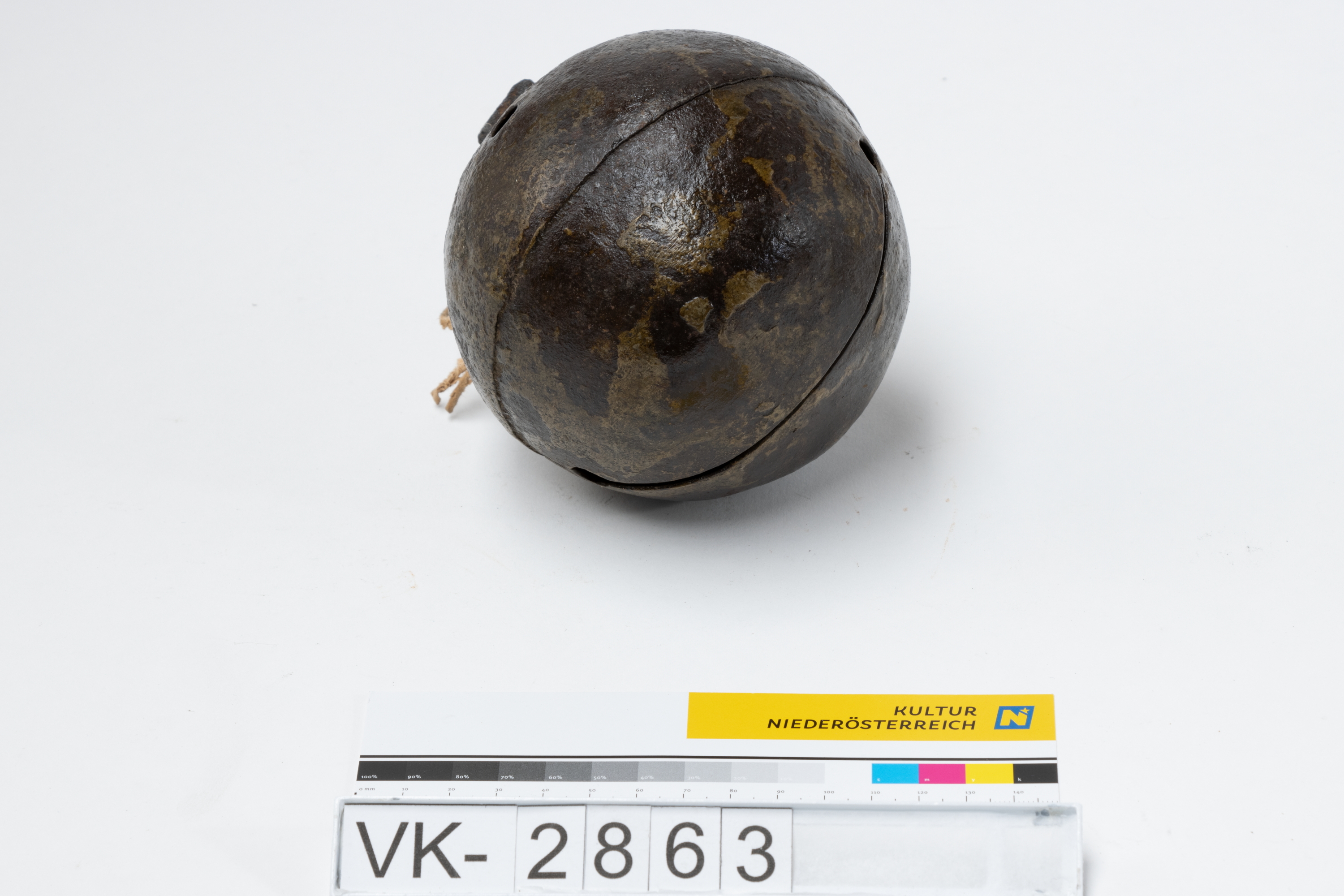 Kugelförmige Kuhschelle mit Löchern auf einer Seite und einem Einschnitt auf der anderen, mit einer Öse zum Aufhängen. Im Inneren der Schelle befindet sich eine Kugel.