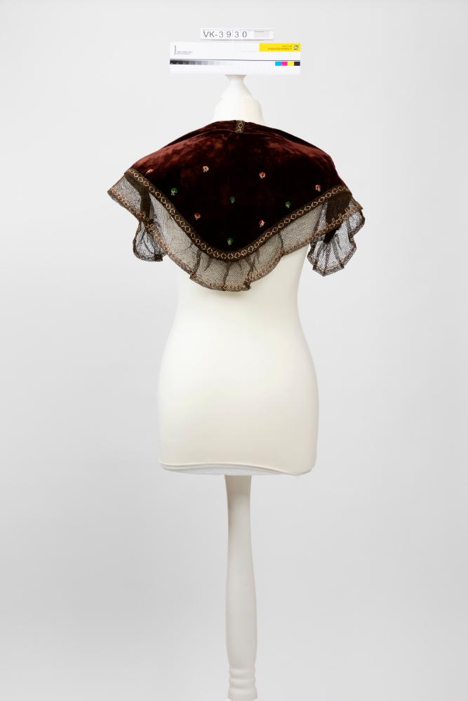 Dunkelbraunes Samttuch in annähernd dreieckiger Form mit einem Netzstoff am Rand und kleinen, mit Glasperlen und verschieden färbigen Garnen gestickten Blümchen.