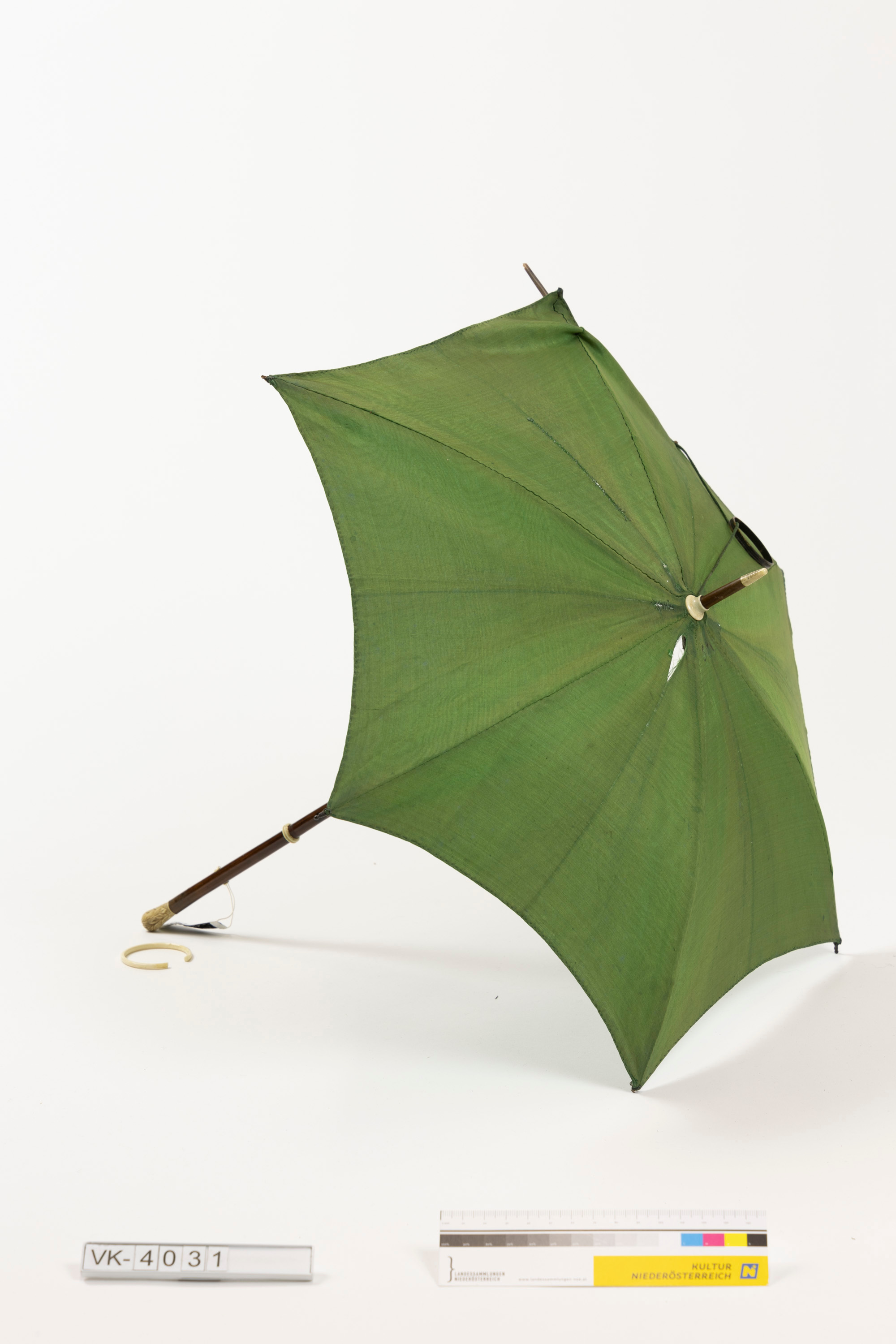 Biedermeier-Schirmchen mit einer Bespannung aus grünem Seidenrips, Metall-Holz-Gestänge und einem mit Blattornamentik gestaltetem Elfenbeinknauf. Zusätzlich befindet sich bei dem Schirm ein aufgebrochener Elfenbeinring als Schließring.