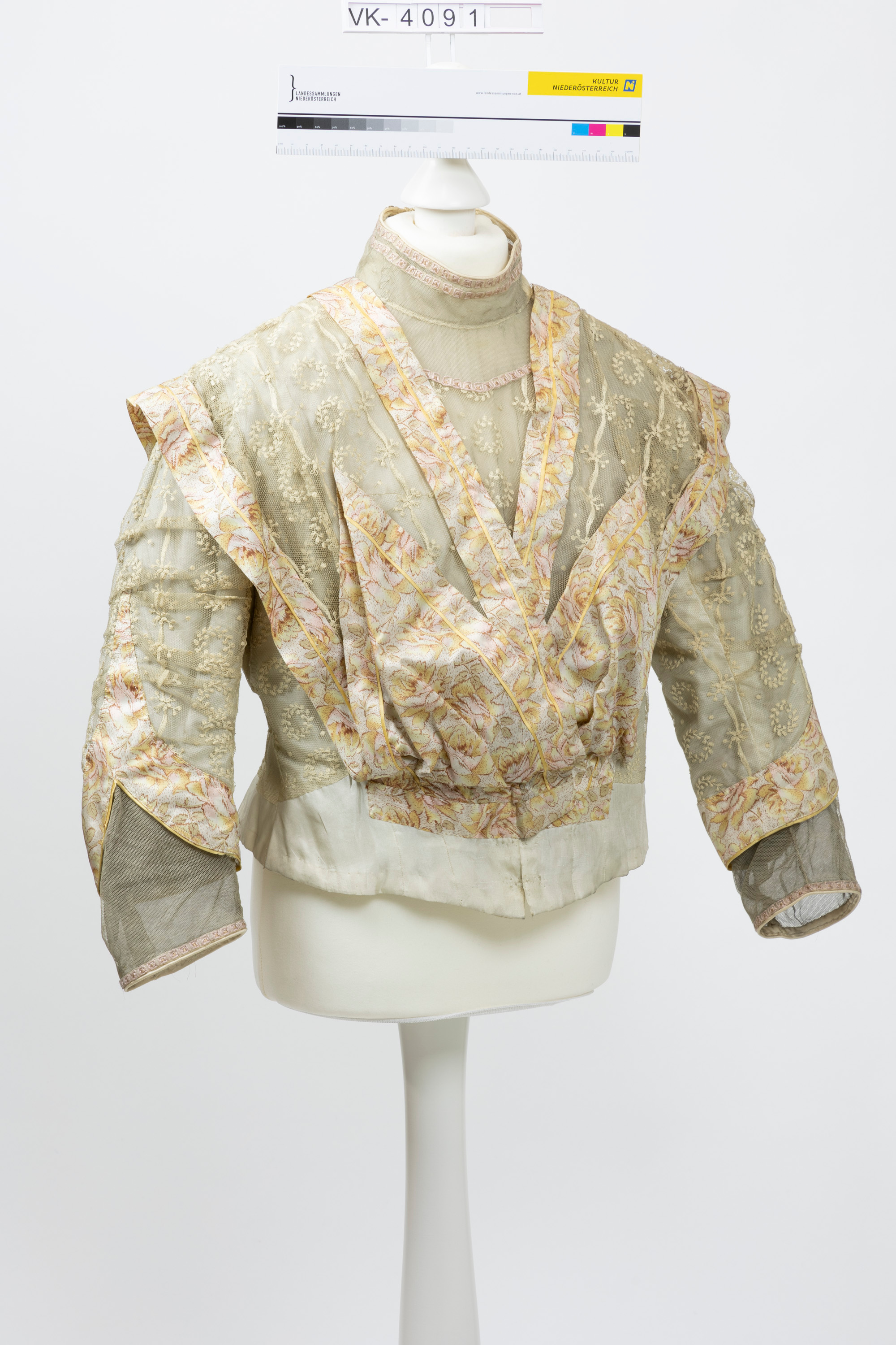 Kurze, taillierte Bluse mit bis zu den Ellenbogen reichenden Ärmeln, hoch geschlossen mit Stehkragen und Druckknopfverschluss. Die Bluse ist zum Teil aus rosa und beige geblümtem Seidenstoff gefertigt, dazwischen sind Einsätze aus weiß besticktem (floral) Tüll, den unteren Abschluss bildet weißer Seidentaft. Die Bluse ist am Kragen und an den Ärmelabschlüssen mit in Mäandern gemusterter Borte verziert.