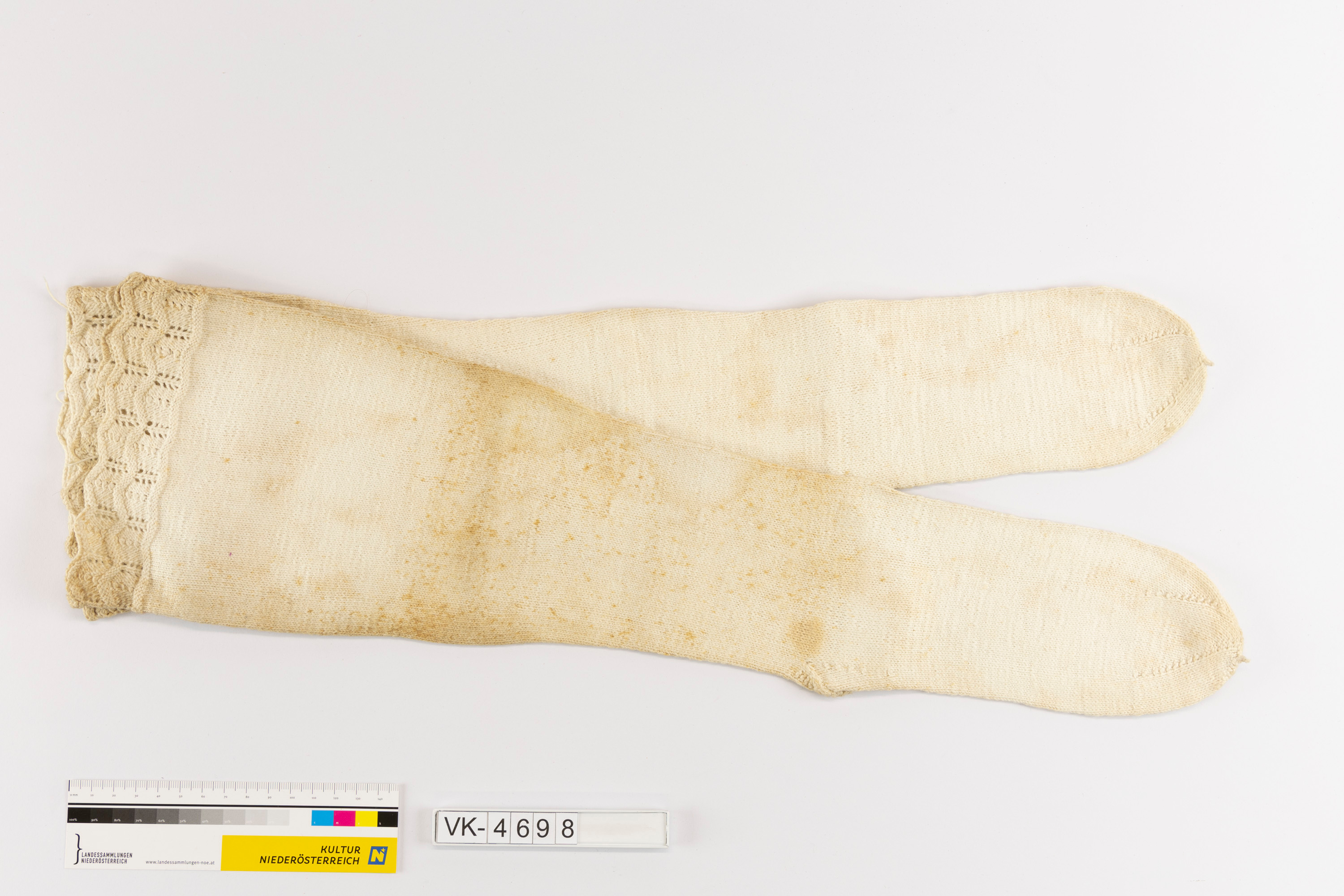 Ein Paar (zusammen genäht) Damenstutzen aus weißem Leinengarn mit Loch- und Blattmuster im oberen Bereich.