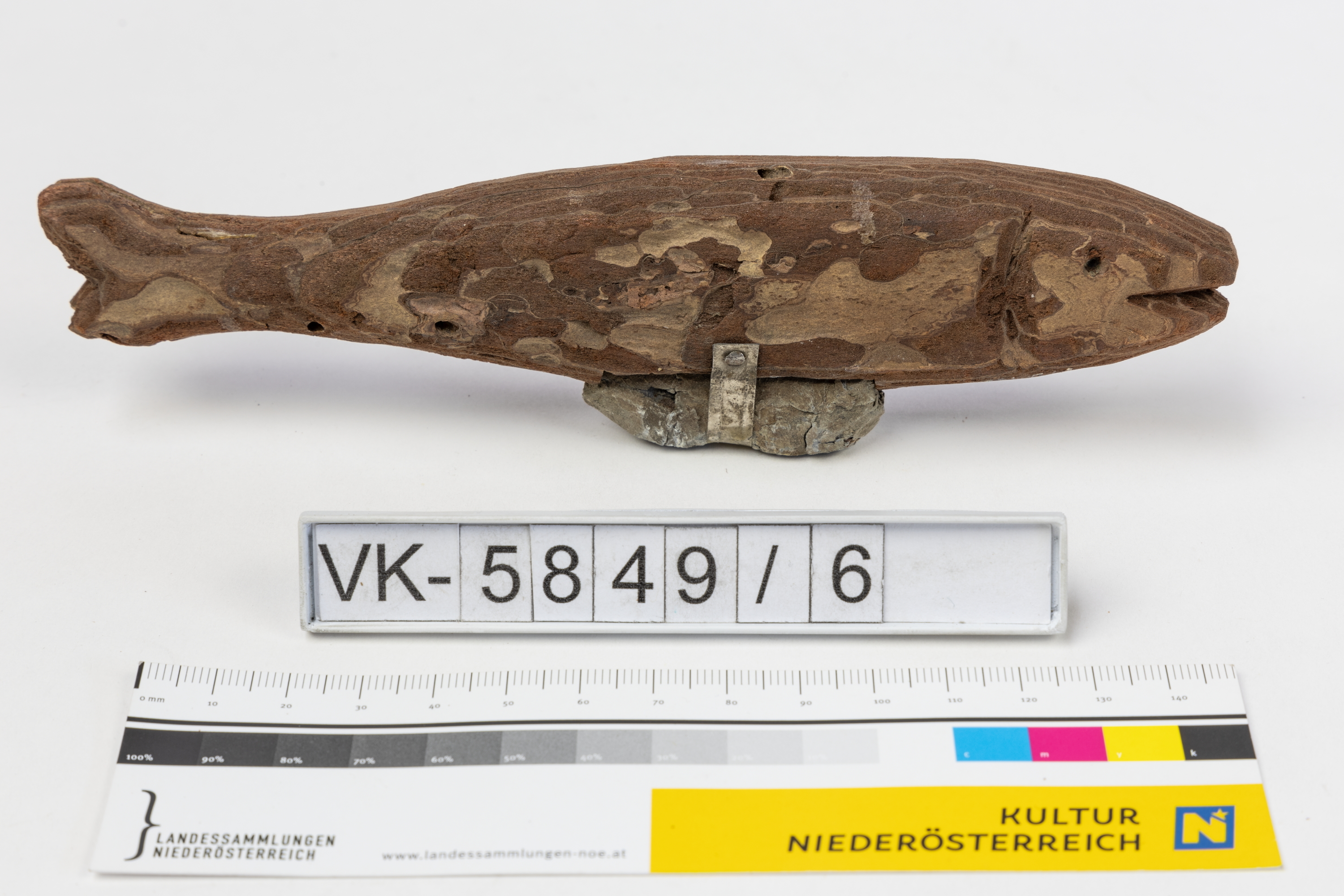 Aus Föhrenrinde geschnitzter Fisch mit einem Tariergewicht aus Blei.