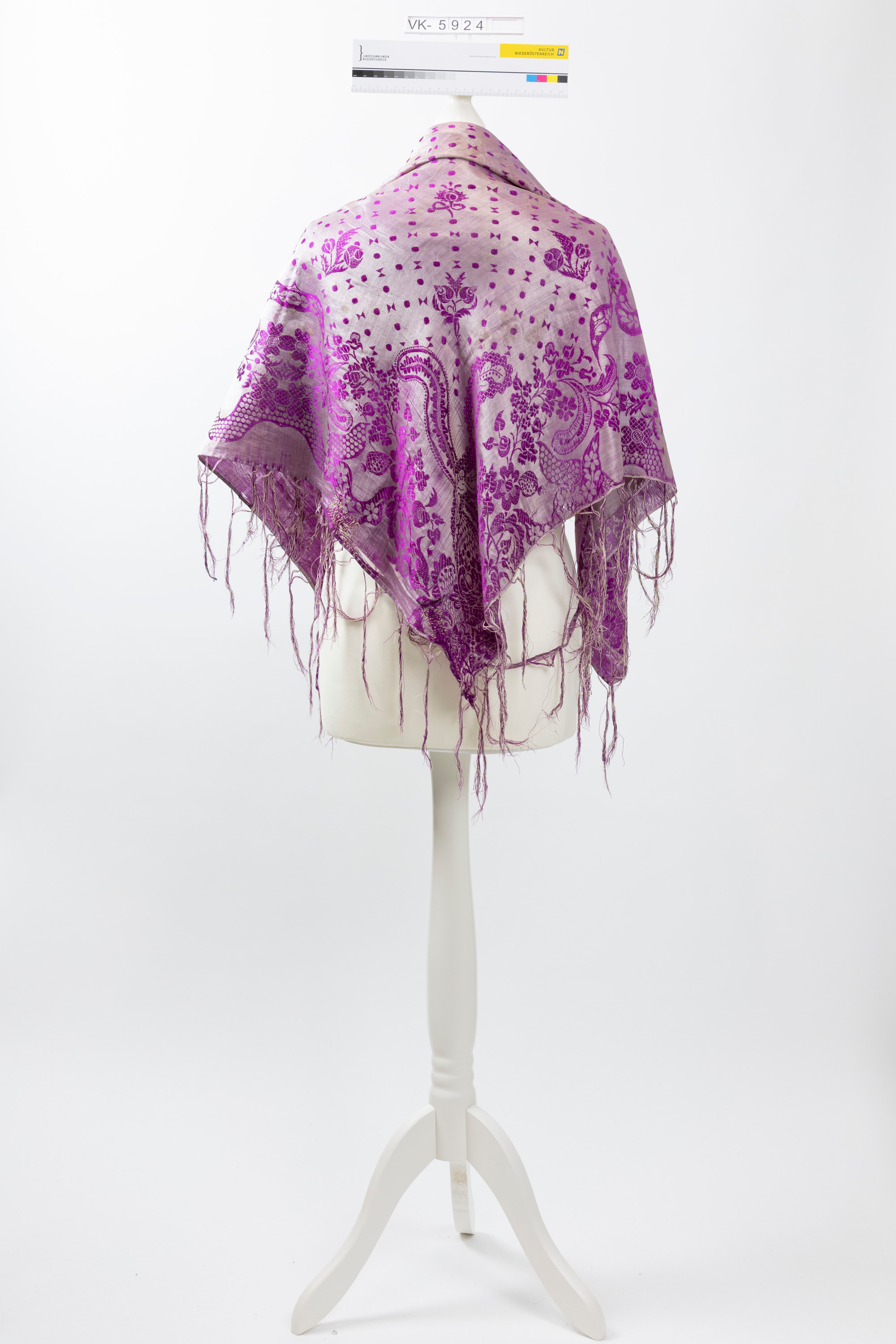 Graubraunes Schultertuch aus Wollstoff, im Randbereich mit einer breiten Blütenborte (Rosen etc.) mehrfärbig bedruckt, mit vernetzten und geknüpften grünen Wollfransen.