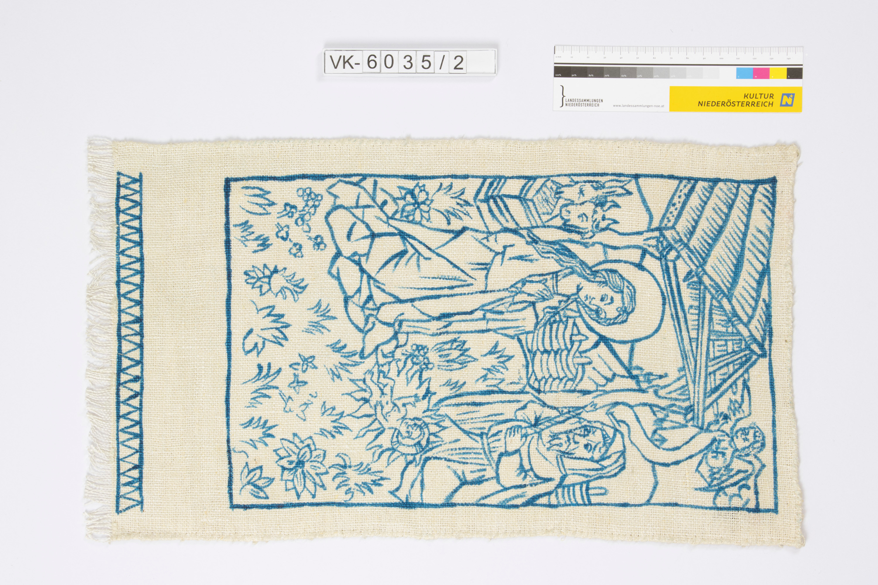Beiger Tischleinwandstoff mit blaugrünem Druck: Eine Darstellung der Geburt Christi mit der Heiligen Familie und dem Stall im Hintergrund, am unteren Rand des Wandbehangs befindet sich eine Zackenborte, und Fransen.