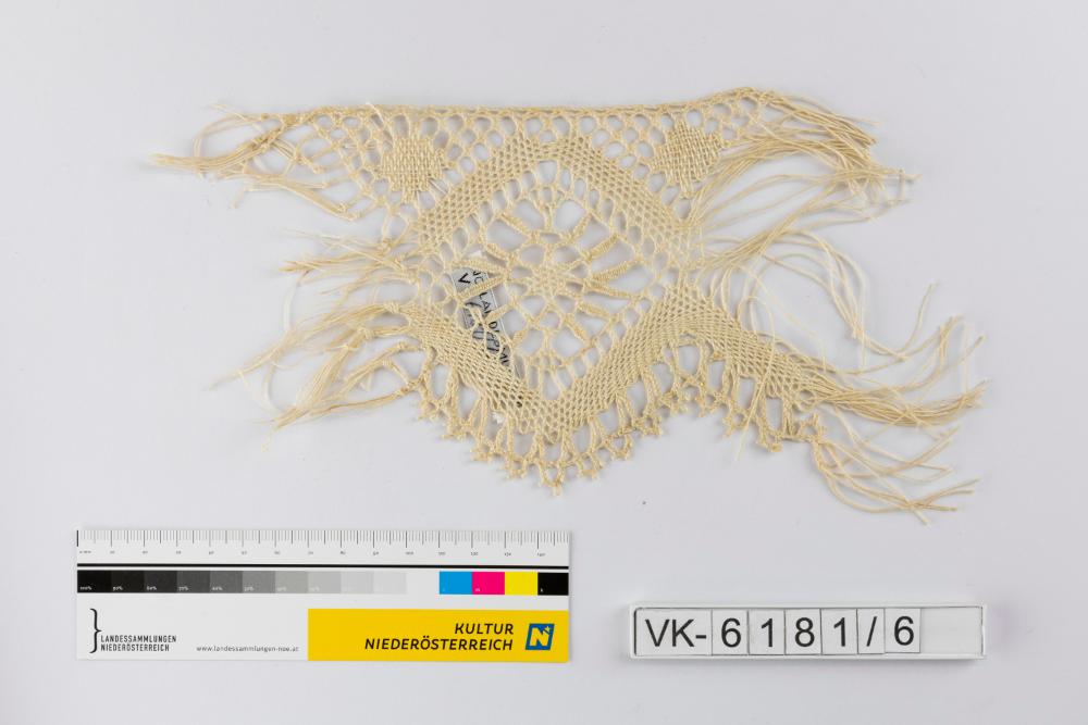Ein Stück Klöppelspitze mit gewelltem Abschluss und einem sternförmigen Element.
