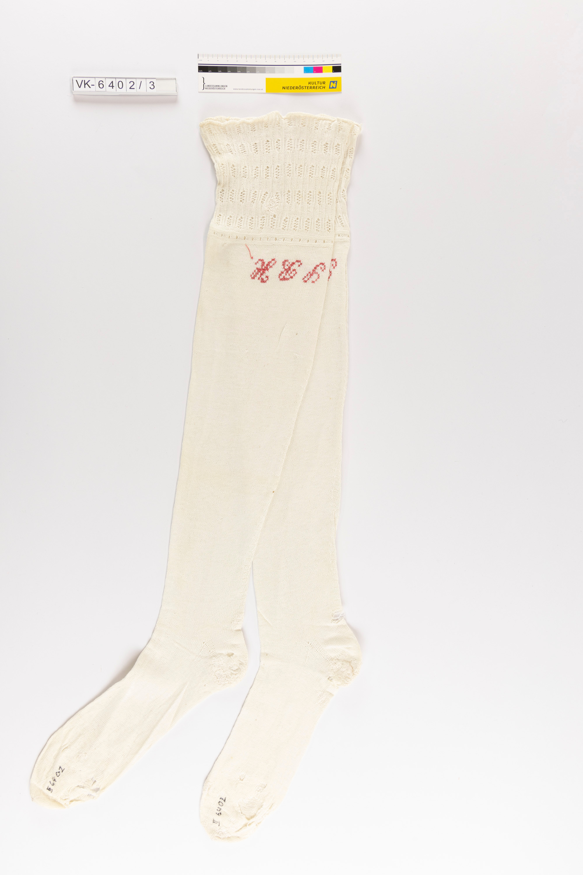 Ein Paar (zusammen genäht) weiße gestrickte Damenstutzen, im oberen Bereich in durchbrochenem Muster gestrickt. Die Stutzen sind mit rotem Garn bestickt: "S B H".
