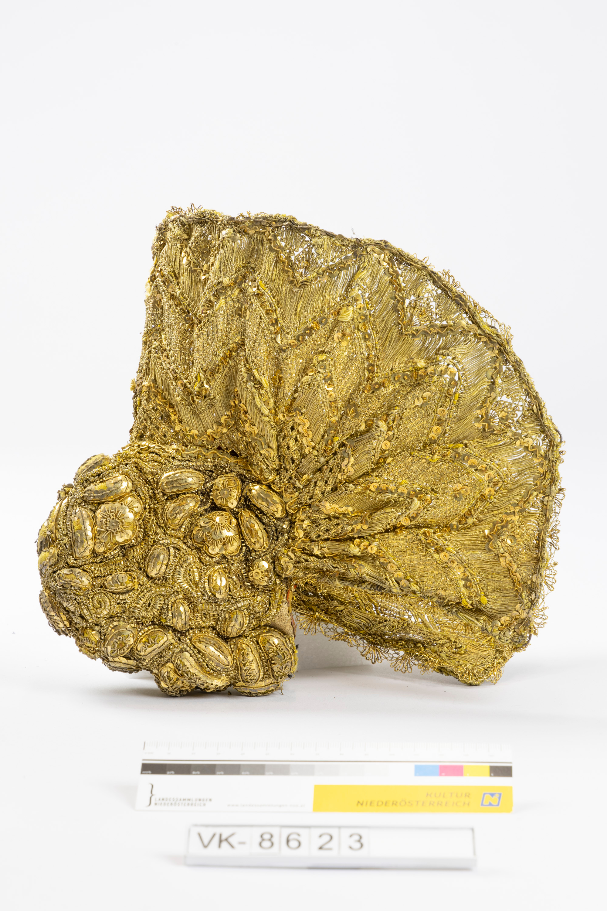 Drahtverstärkte Goldhaube, vollflächig mit Golddrahtstickerei, Pailletten und Goldkügelchen besetzt. Die Haube hat ein gemustertes Krawattenseidenfutter. Die Haube hat einen kleinen Kopf und Boden und einen sehr breiten Schirm, der flügelartig ausläuft. Laut Inventarbuch handelt es sich um eine Kindergoldhaube, laut Karteikarte um eine Frühform der Linzer Haube, daher auch die dortige Datierung. Wegen des außerordentlich guten und fast neuwertigen Zustands der Haube betrifft die Datierung möglicherweise die Haubenform.