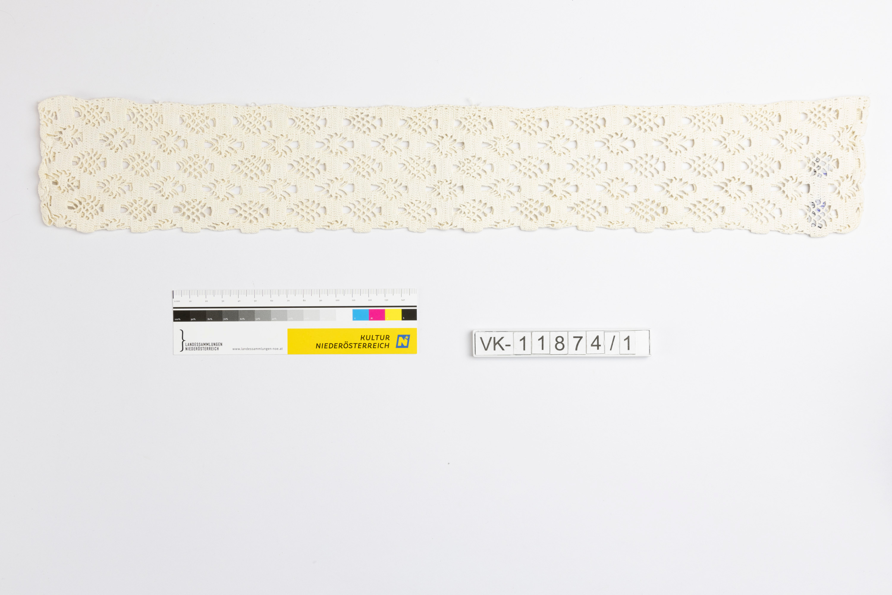 Zusammen genähte, an einer Längsseite offene, weiße Häkelspitze mit rautenförmig durchbrochenem Muster. Wahrscheinlich für einen Polster.