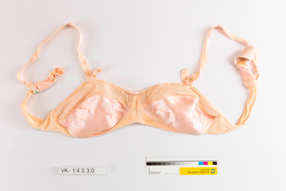 Büstenhalter aus glänzendem rosa Stoff, der obere Bereich der Körbchen ist mit einem Netzgewebe ausgeführt, ebenso Teile des Bandes. Als Verschluss dienen braune Knöpfe, an die eine zusätzliche Verlängerung aus rosa Gummiband mit einem Zwirnknopf gehängt ist. Der Büstenhalter hat ein Etikett: "PALMERS 85".