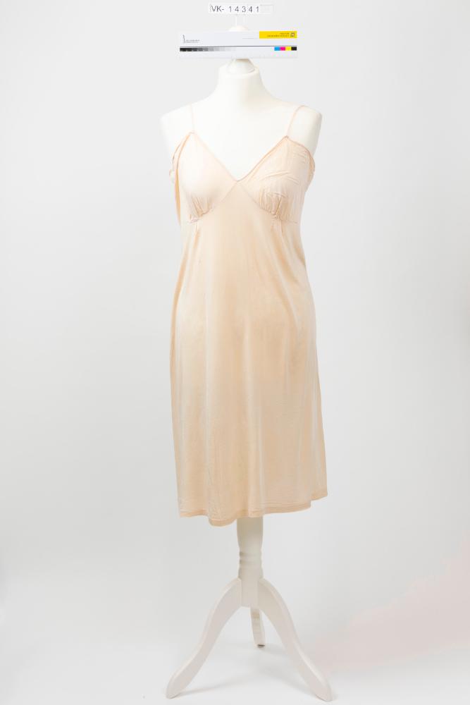 Beiges glattes Nachthemd, unter der Brust gezogen, mit V-Ausschnitt und dünnen weißen Trägern.