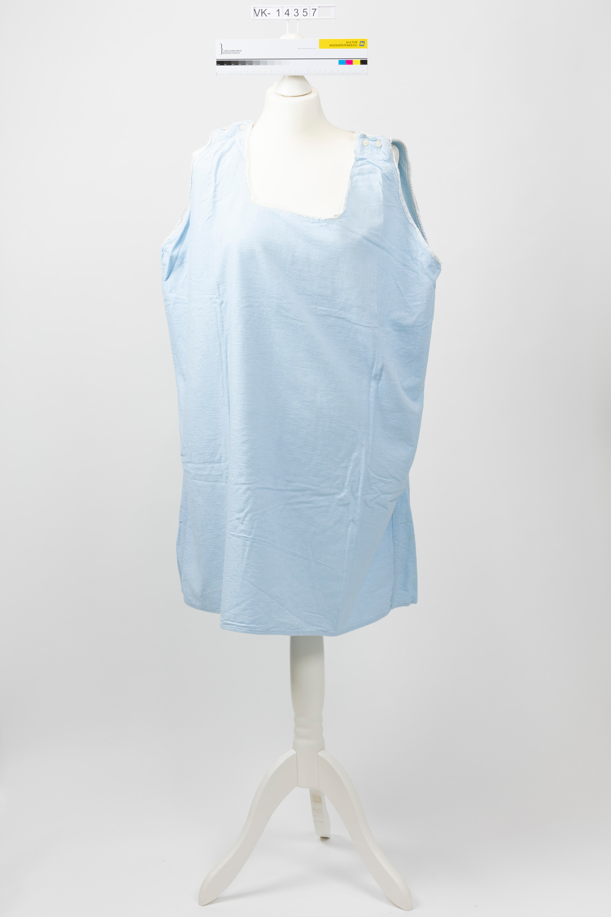 Ärmelloses hellblaues Nachthemd mit eckigem Ausschnitt, die oberen Kanten sind mit einem feinen weißen Spitzenbesatz verziert. Das Nachthemd ist auf den Trägern zu knöpfen.