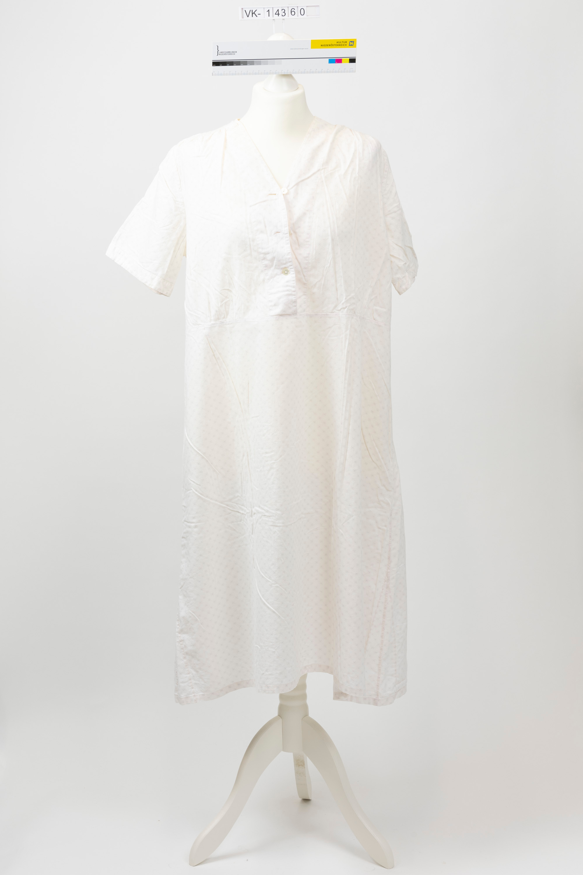 Kurzärmeliges Nachthemd mit V-Ausschnitt und kurzer Knopfleiste, aus einem weißen, mit feinen Pünktchenquadraten gemusterten Stoff.