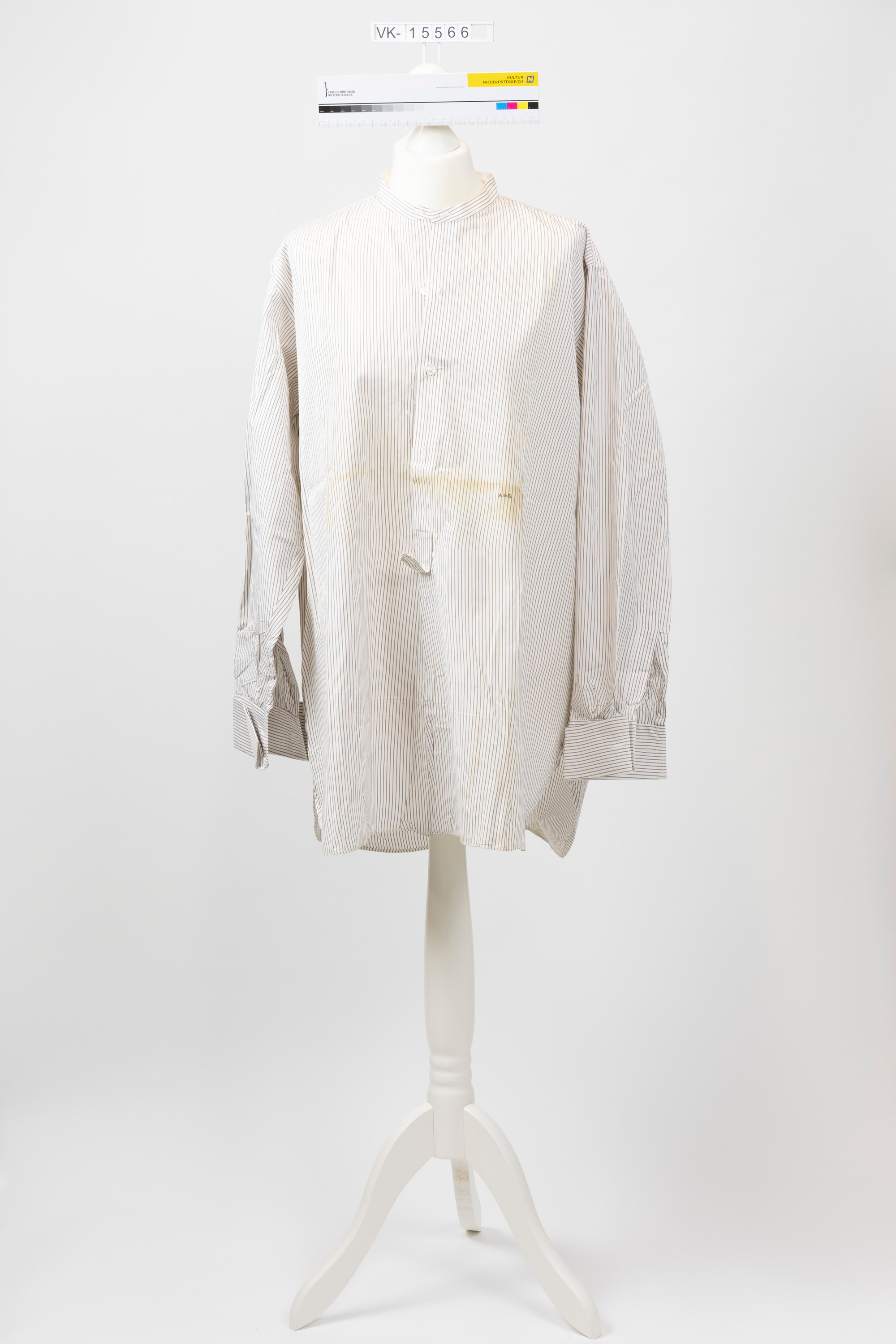 Braun gestreiftes Herrenhemd (VK-15566a), langärmelig mit Manschetten, mit Knopfleiste bis zur Mitte und einem anknöpfbaren Spitzkragen (VK-15566b). Das Hemd hat eine Monogrammstickerei: "AGG". Das Hemd hat ein Etikett: "CARL BERECZ GEGR. 1878 WIEN".