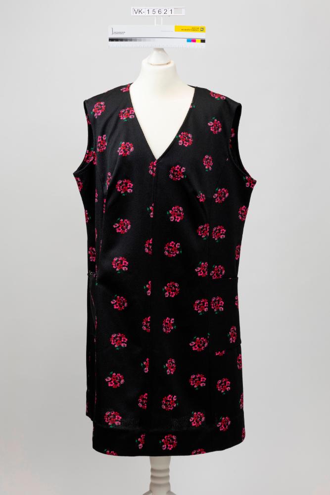 Ärmelloses Kleid mit zwei Taschen und V-Ausschnitt, der Stoff ist schwarz glänzend mit Blumenbuketts in Rottönen.