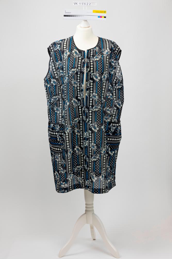 Ärmelloses Kleid mit rundem Ausschnitt und zwei Taschen. Der Stoff ist auf schwarzer Grundfarbe mit blauen Streifen, weißen Punkten und weiß-blauen Blüten bedruckt.