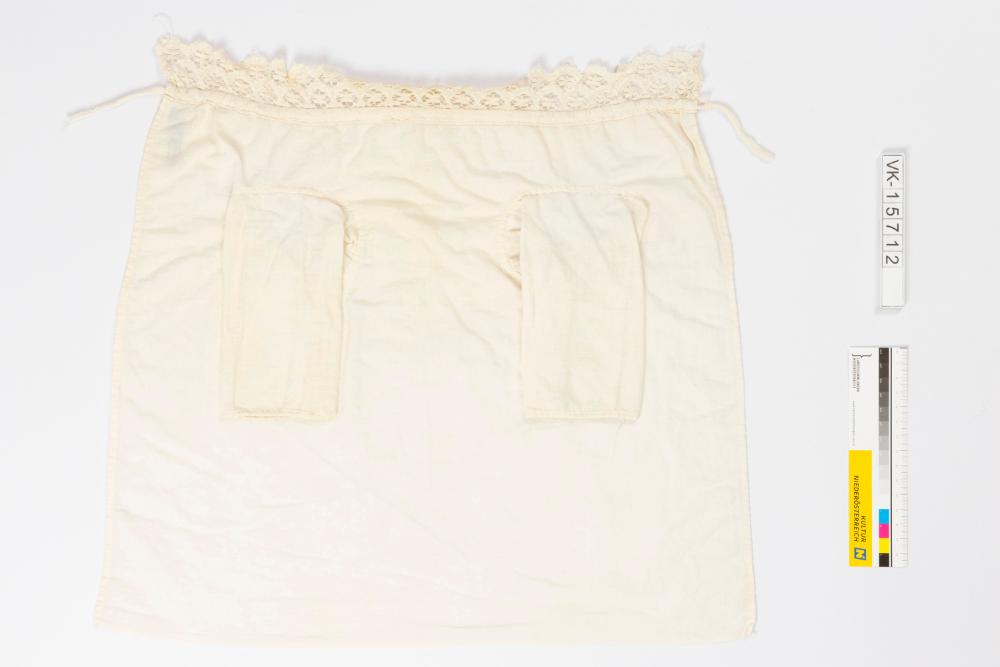 Weißes Babyhemdchen, einseitg offen, mit langen Ärmeln und zylindrischem Schnitt. Am Halsausschnitt befindet sich ein Durchzug für ein Bändchen, der Halsabschluss ist mit einer Klöppelspitze verziert.