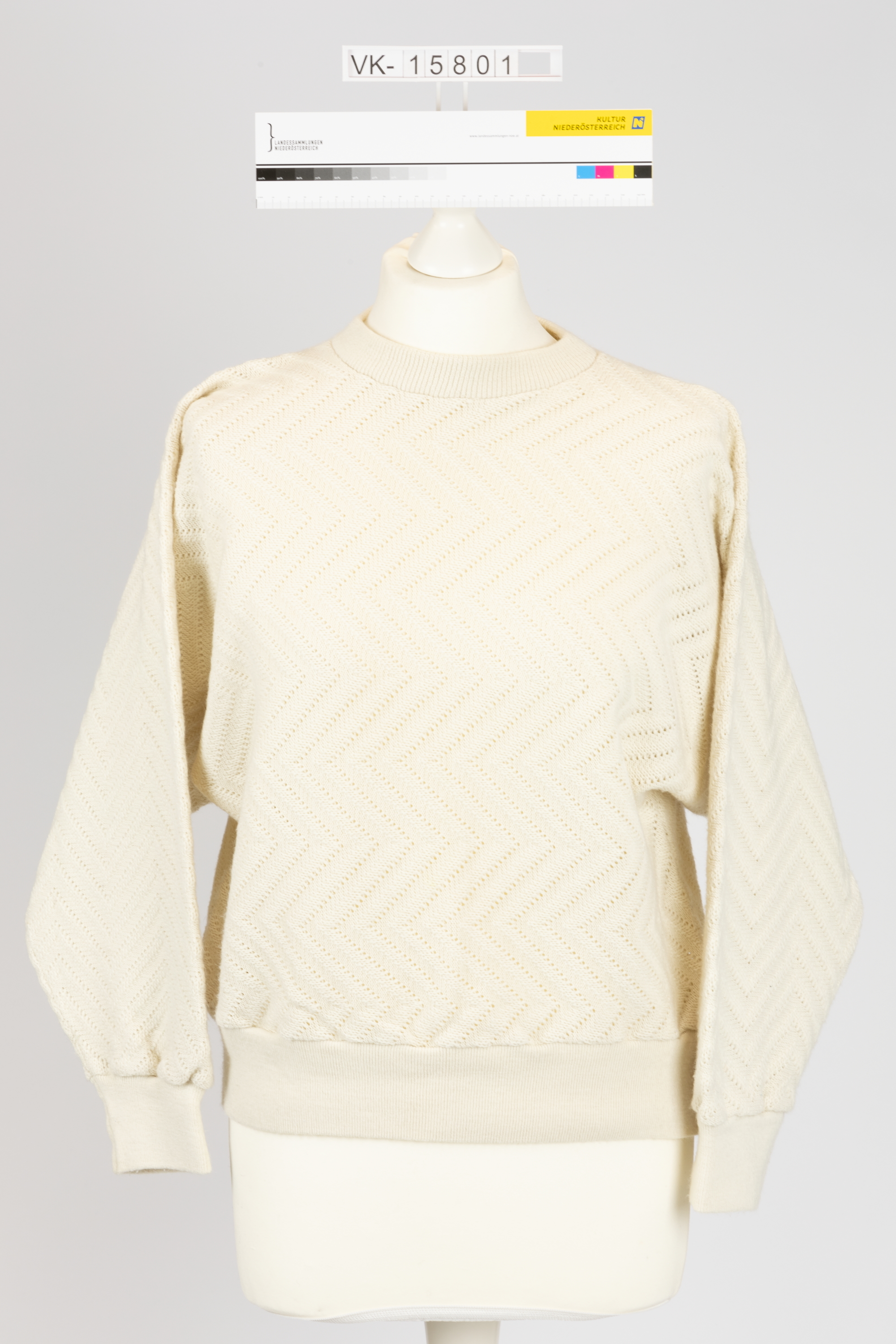 Weißer Pullover mit Rundhalsausschnitt und sehr breit angesetzten Ärmeln, im Fischgrätmuster gestrickt.