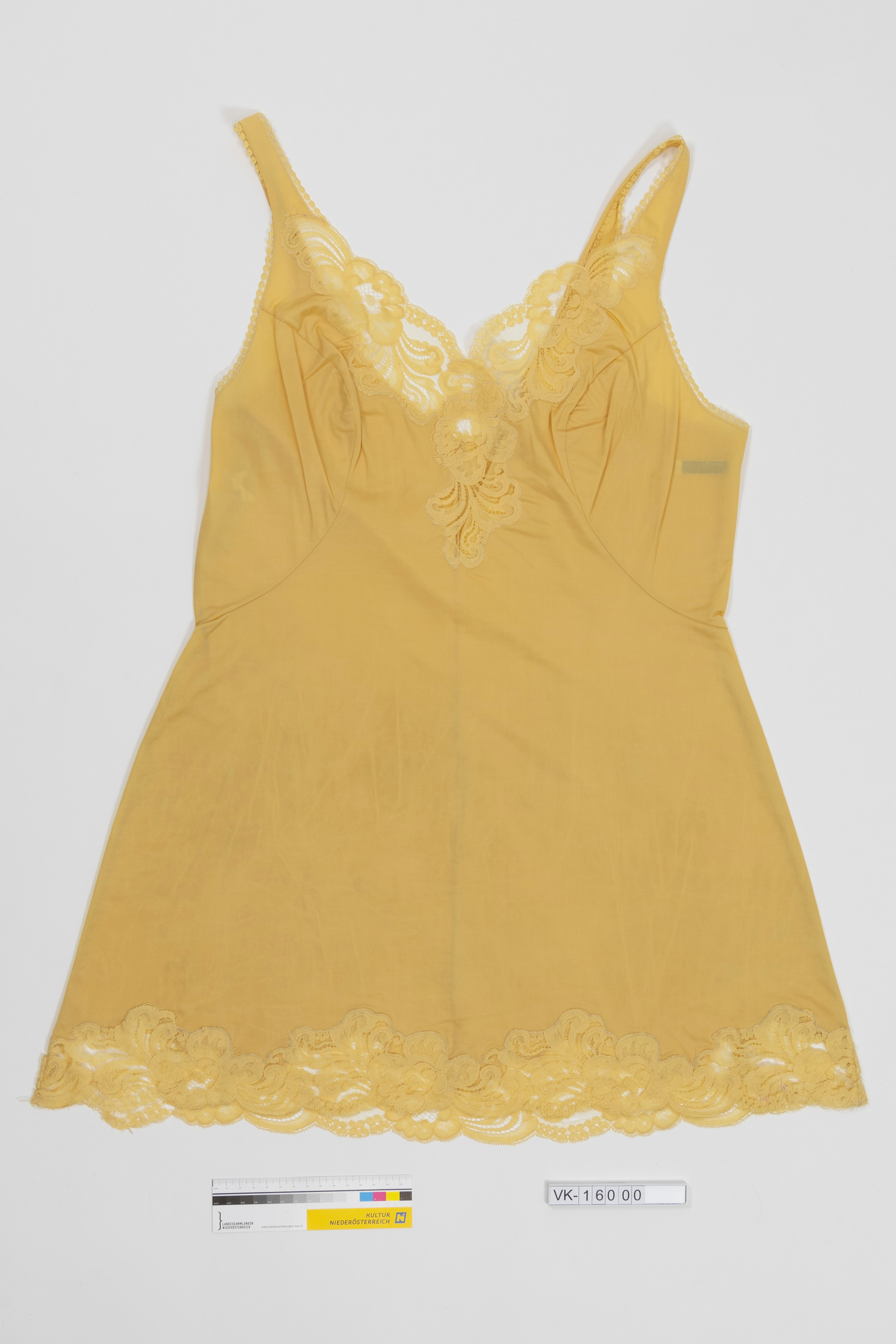 Ockergelbes Unterkleid (Negligé) mit breitem floralem Spitzenbesatz an der Unterkante und im Ausschnitt, die restlichen Kanten sind mit einer schmalen Spitzenborte besetzt.