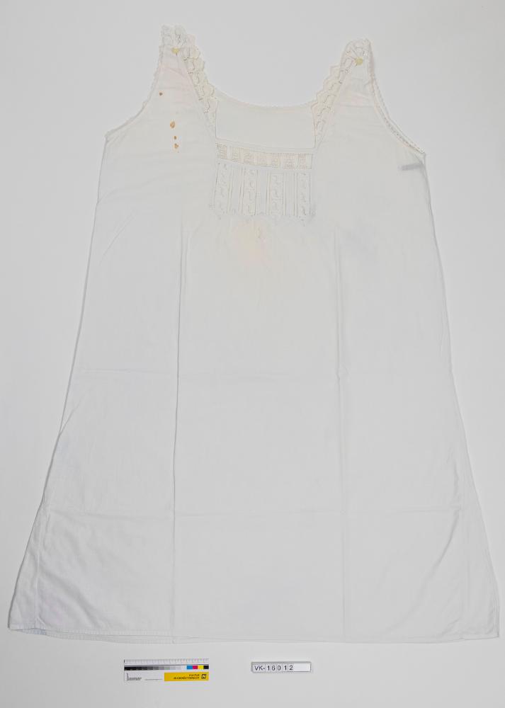 Weißes ärmelloses Leinennachthemd mit eckigem Ausschnitt und Baumwollspitzenbesatz im Ausschnitt und an den Schultern. Auf der Brust hat das Nachthemd einen annähernd rechteckigen Einsatz mit verschiedenen Weißstickerei- und Ajourmustern.