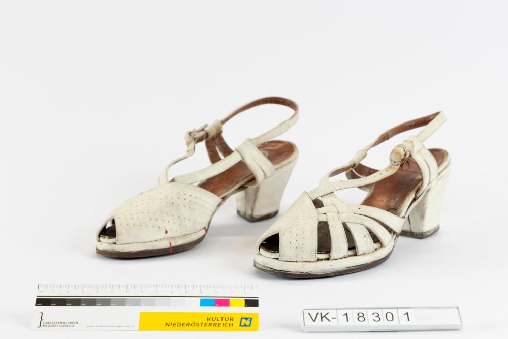 Ein Paar (a, b) Damensandalen aus weißem Leder mit halbhohem Absatz und teilweise geschlossener Schuhspitze.