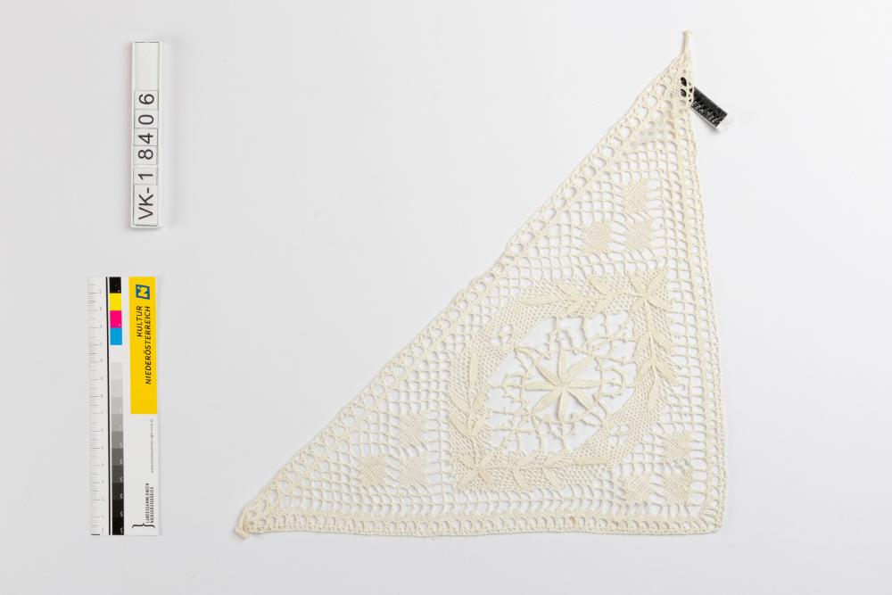 Dreieckiges Spitzendeckchen mit einem linsenförmigen Mittelteil, dessen Mitte ein ovales Radelement bildet.
