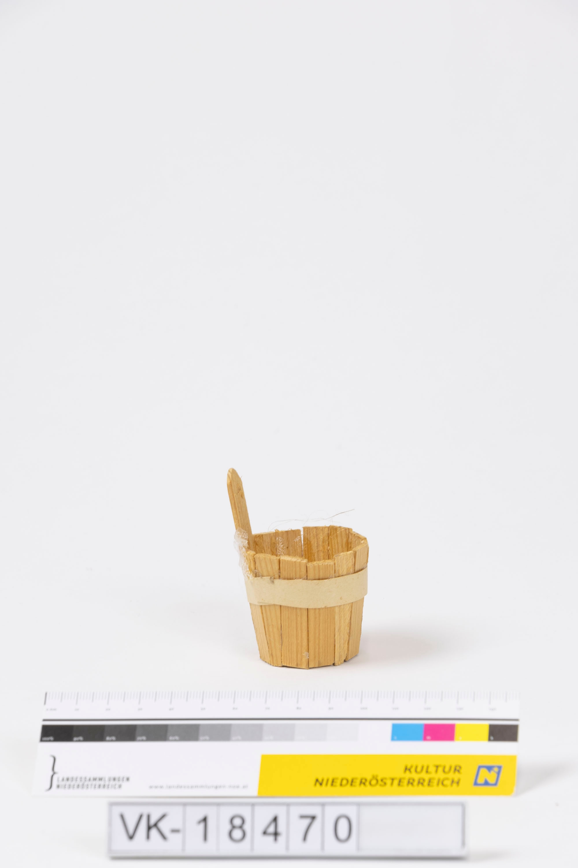 Kleines hölzernes Schaff, eine Daube ist verlängert ausgeführt mit einem Griffloch. Das Schaff ist ein Zubehör zu den Dodolafiguren, es gehört wahrscheinlich zu VK-11846 oder VK-11847.
