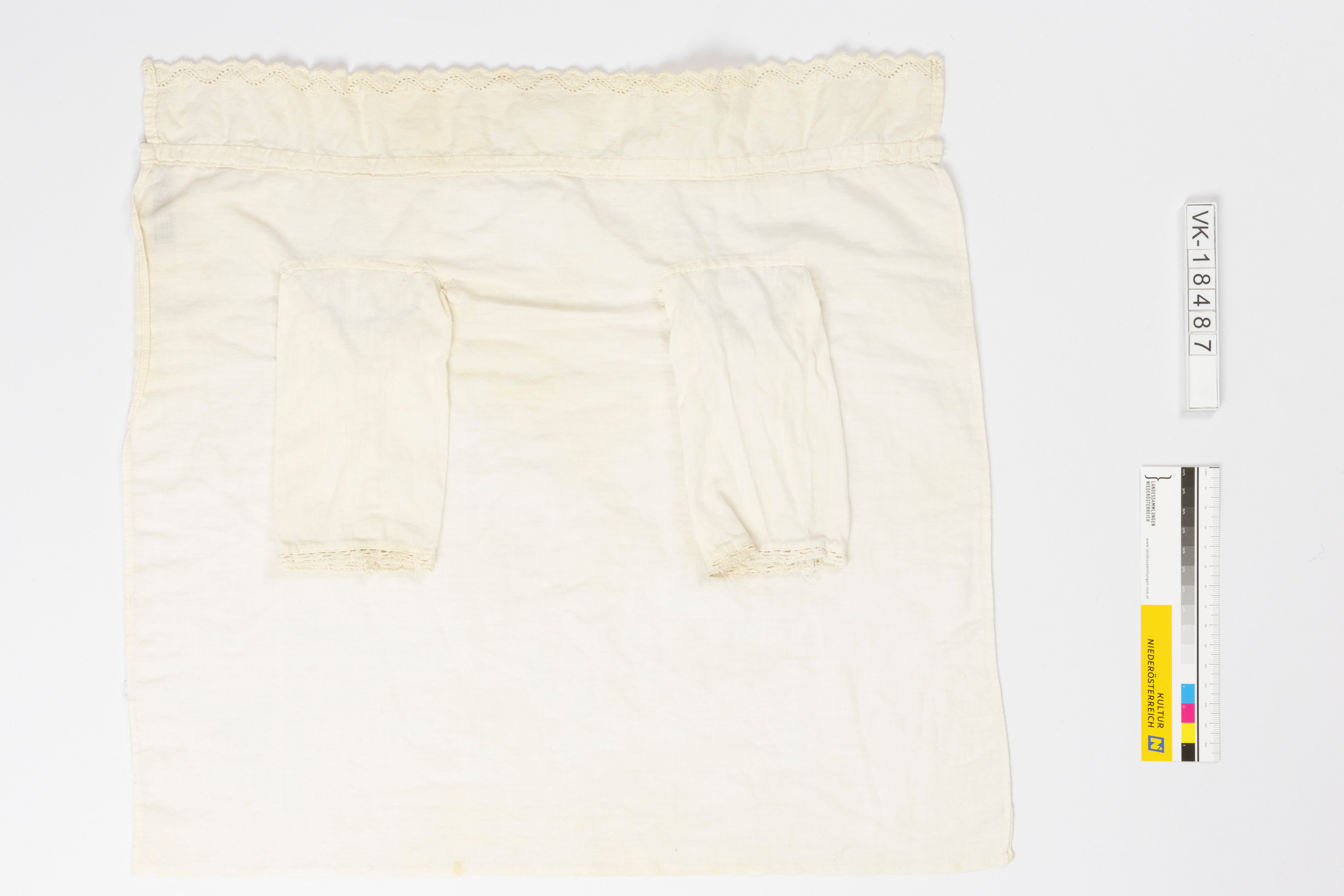 Weißes Babyhemdchen, einseitg offen, mit langen Ärmeln und zylindrischem Schnitt. Am Halsausschnitt befindet sich ein Durchzug für ein Bändchen, Halsabschluss und Ärmelabschlüsse sind mit schmalem Spitzenbesatz verziert.
