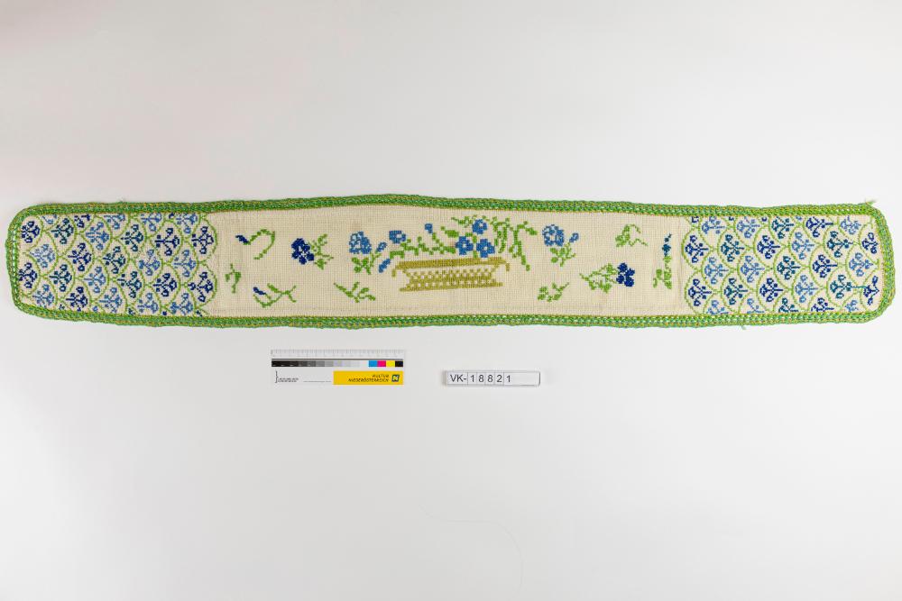 Längliches Deckchen (Läufer) aus beigem Aidastoff, gefasst mit einer grünen gehäkelten Borte. Das Deckchen ist mit verschiedenen floralen und stilisiert-floralen Motiven im Kreuzstich mehrfärbig bestickt.