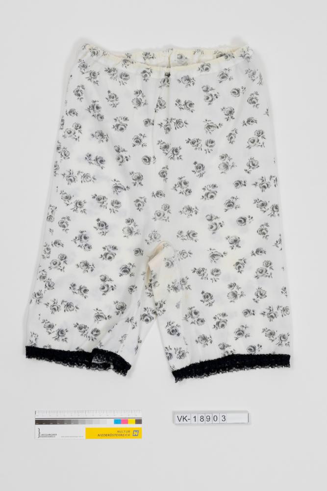 Halblange weiße Baumwollunterhose (Größe 46/48) mit schwarzem Rosenblütenmuster, mit Gummizug in Bund und schwarzem Spitzenbesatz an den Beinabschlüssen.