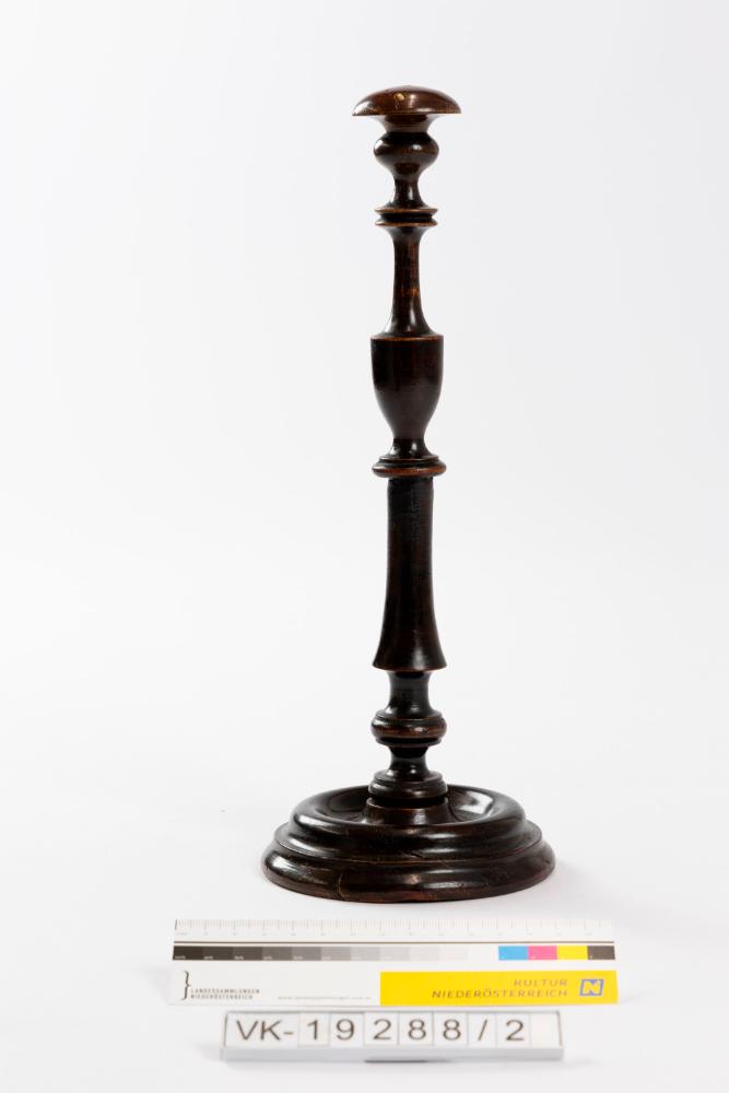 Schwarzbrauner gedrechselte Hutständer aus Holz mit pilzförmiger Auflage.
