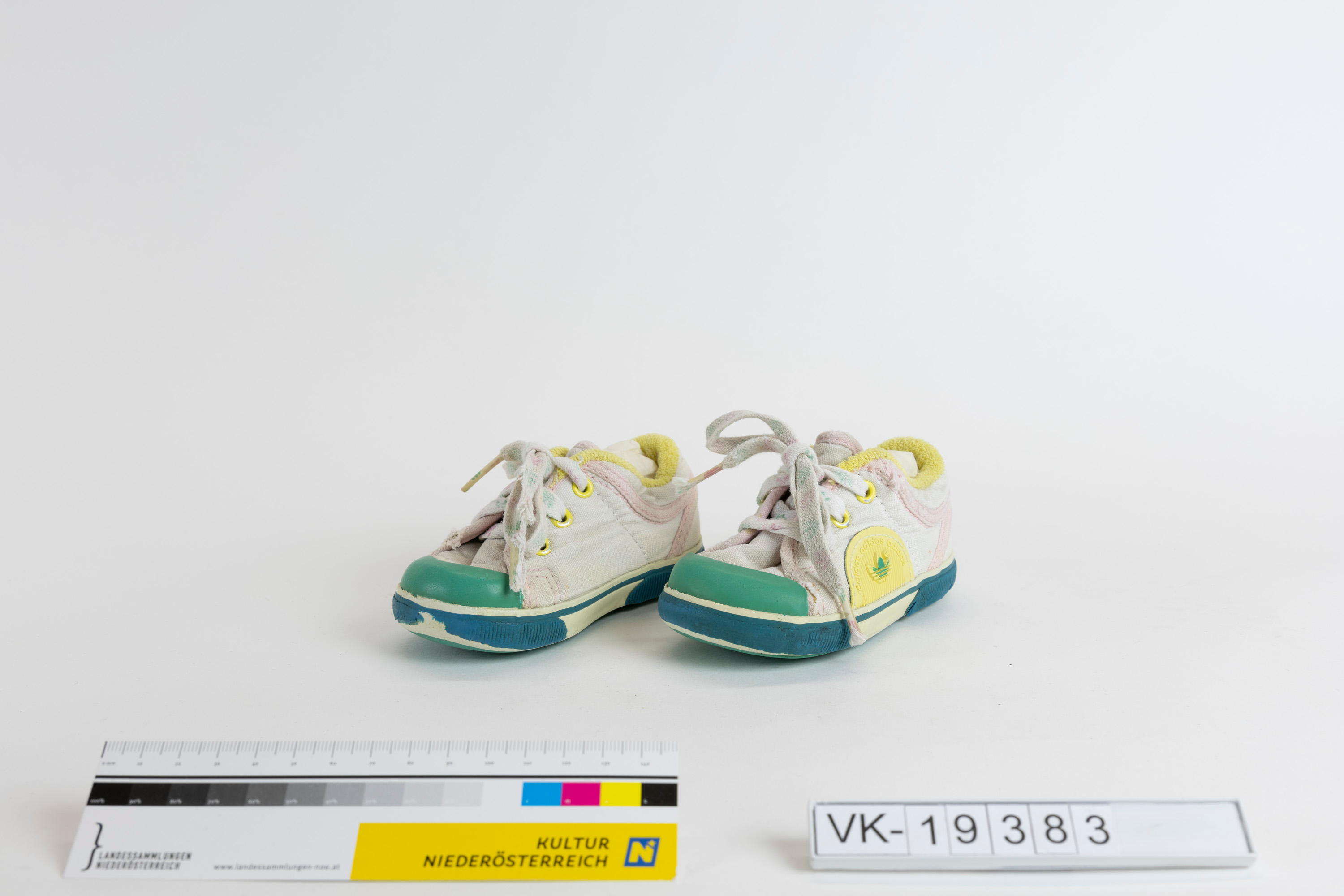 Ein Paar rosa Kinderschuhe (a, b) mit gelbem Futter, grünen Gummikappen und seitlichen halbrunden gelben Gummieinsätzen mit dem Markenzeichen und der Beschriftung: "adidas".