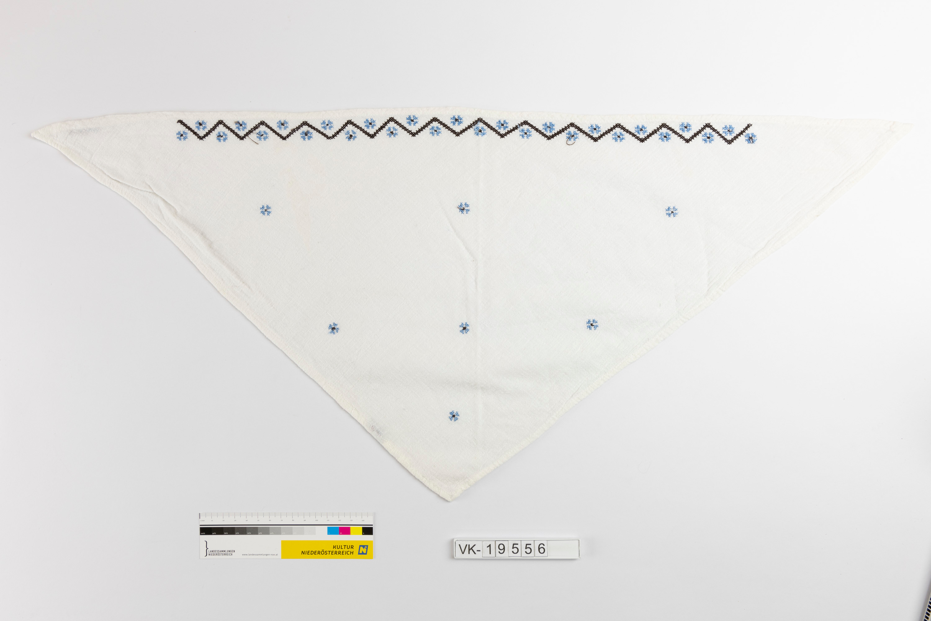 Dreieckiges weißes Baumwollkopftuch (klein, wahrscheinlich für Mädchen), verziert mit Kreuzstichoptik in blau und schwarz (stilisierte Blüten, Zackenborte).