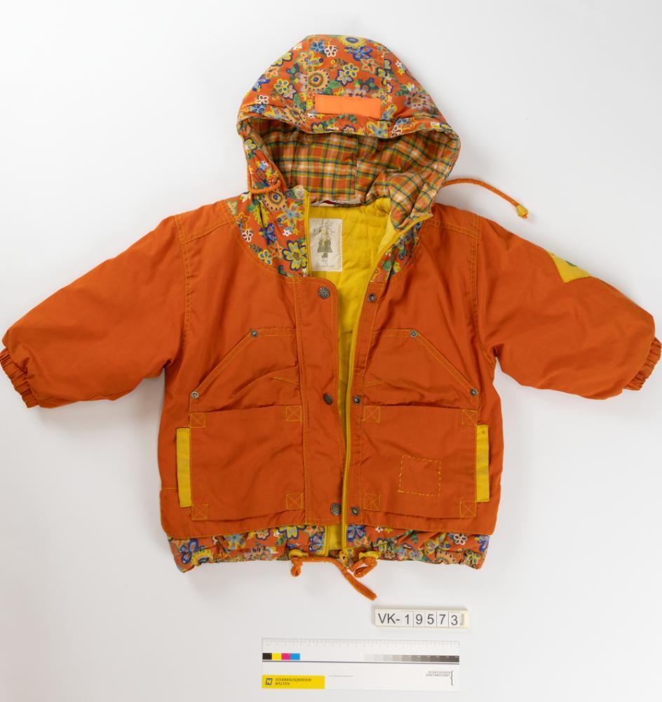 Orange Kinderkapuzenjacke (Größe 98), am unteren Abschluss und an der Kapuze aus geblümtem Stoff, mit gelben Ziernähten, Jacke gelb und Kapuze mehrfärbig kariert gefüttert. Die Jacke hat Gummibündchen an den Ärmeln, orange Zugbändchen an Kapuze und unterem Abschluss und ist mit Applikationen verziert: Nagetiere mit Kürbis und "Country life" auf dem Rücken, darunter Reflektorstreifen, auf der Kapuze ein Reflektorstreifen, auf dem linken Ärmel eine Raute mit Kürbisgesicht und "Country life". Die Jacke hat ein Etikett: "Minni-Girl Pinocchio".