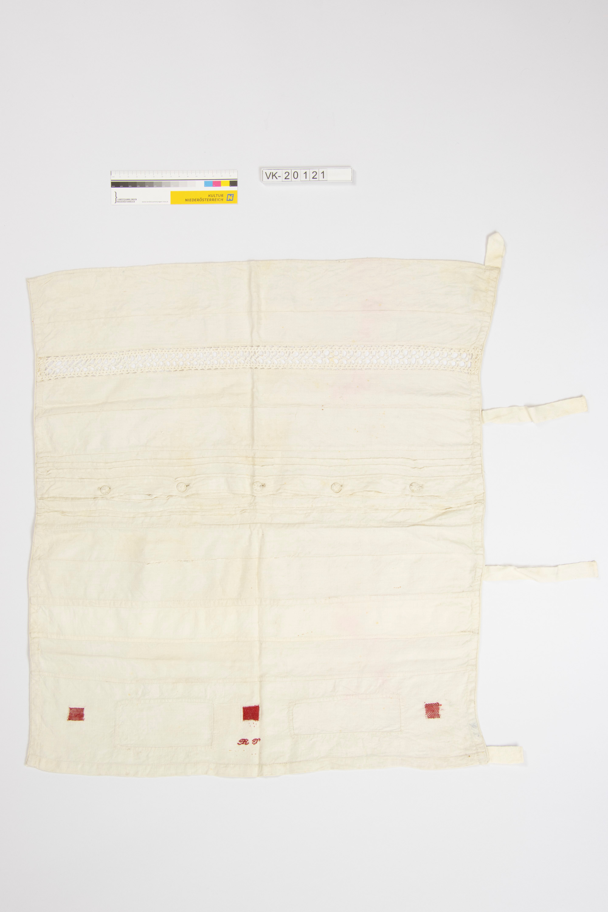 Mustertuch aus weißem Feinleinen: Das Tuch hat eine eingesetzte Spitzenborte, Biesen, eine Knopfleiste mit Zwirnknöpfen, eingesetzte Flicken und eine rote Bestickung im Kreuzstich: "RP".